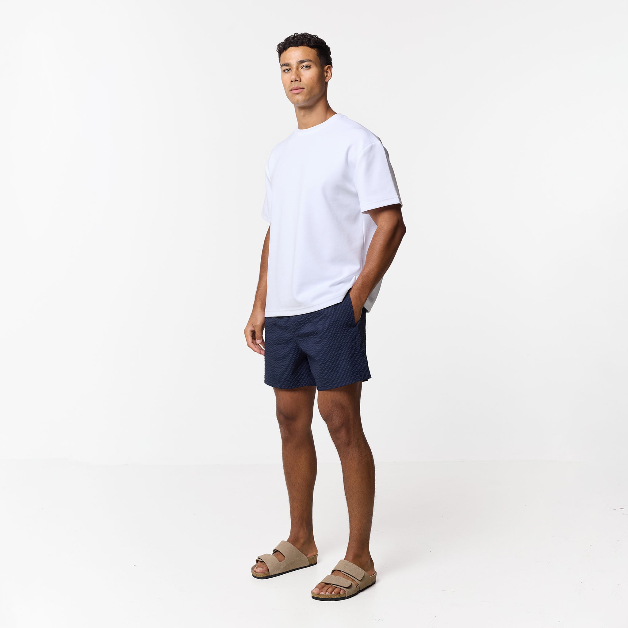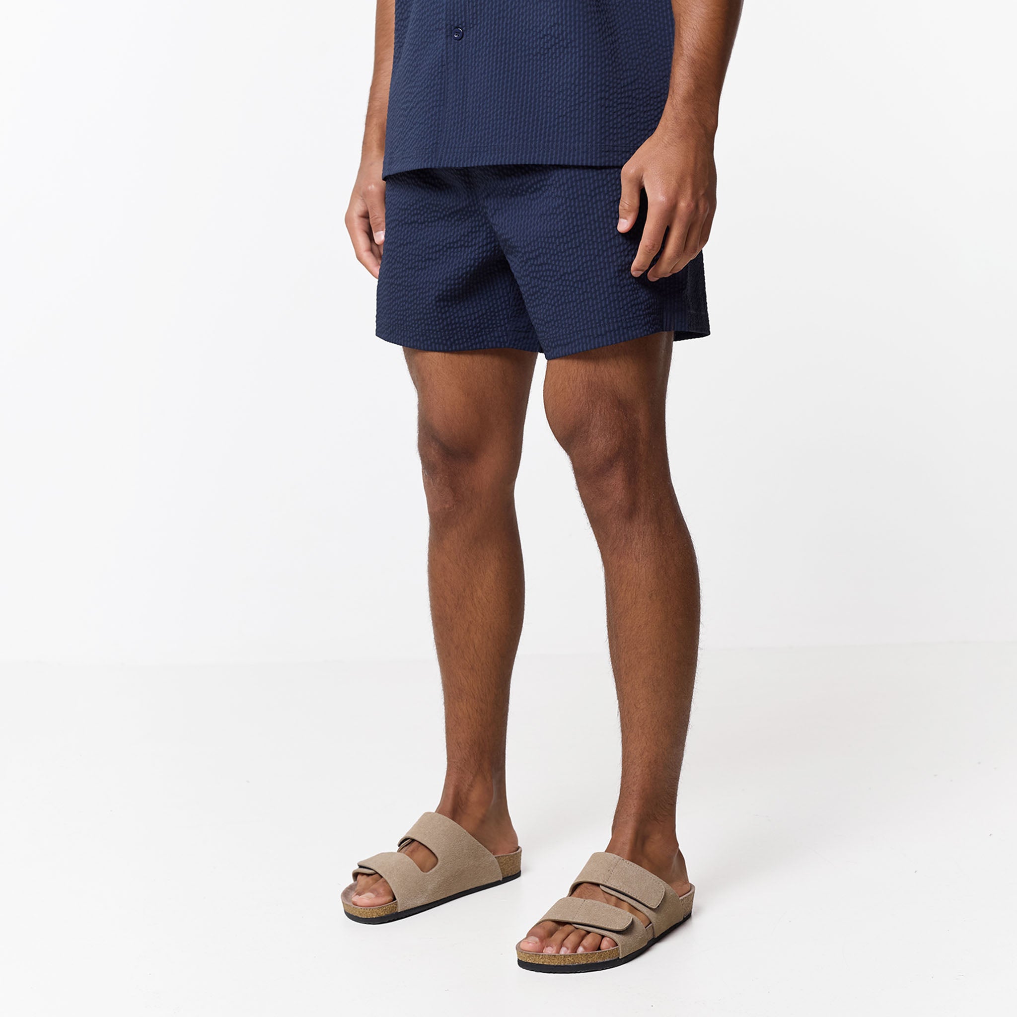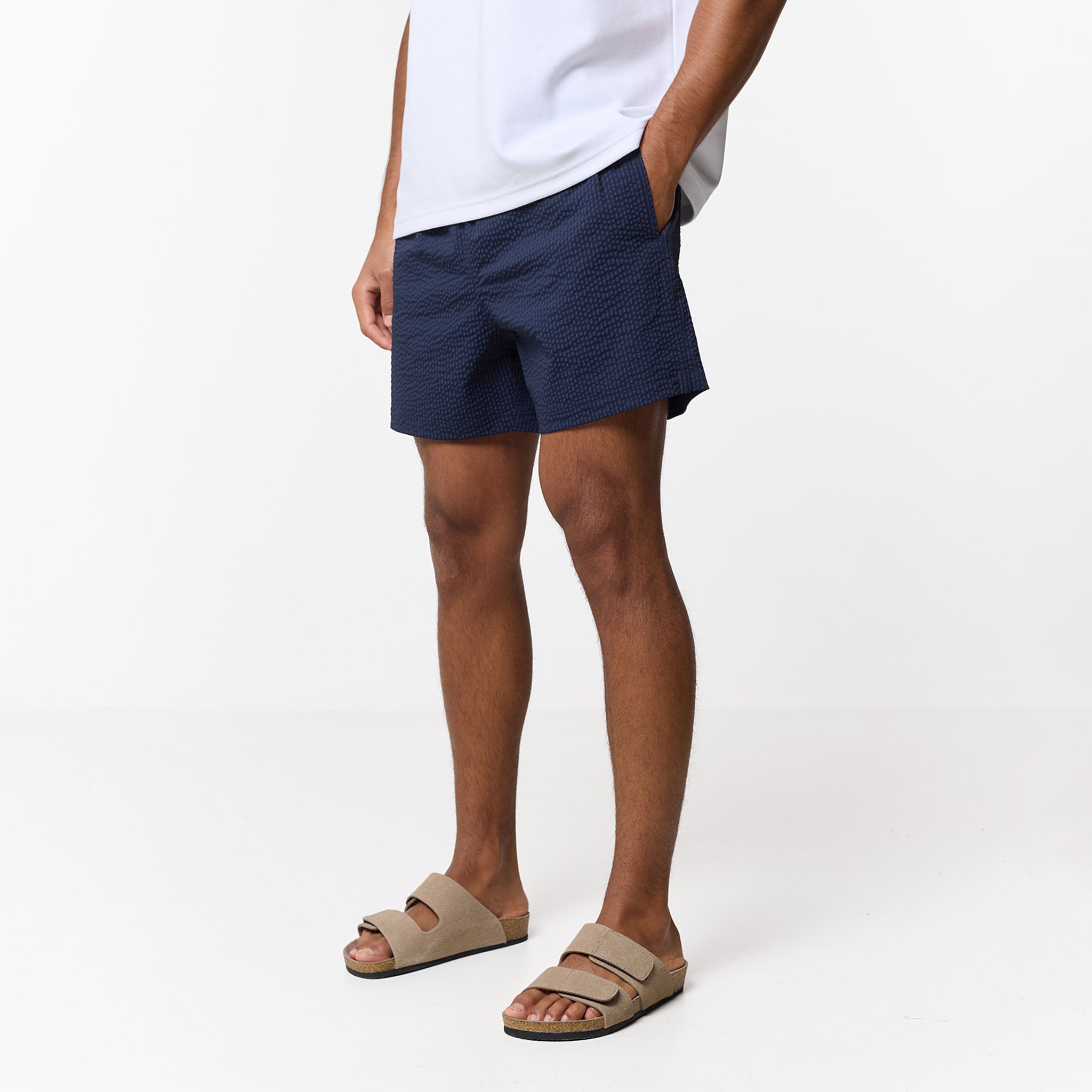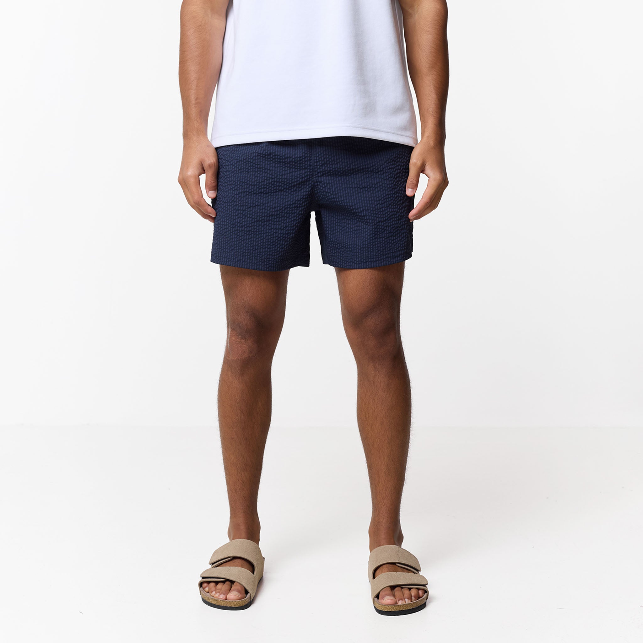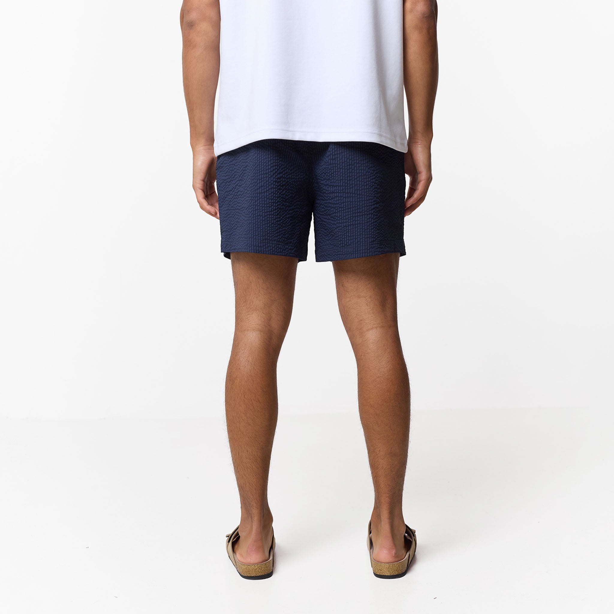 Introducing the signature Navy Seersucker swimshorts, a timeless cornerstone of any vacation wardrobe designed to align perfectly with the matching button-down shirt for a sharp look. These swim-shorts feature a mesh interior lining and a low-profile waistband, reinforced by tonal embroidered eyelets and a durable, rubber-capped drawcord for a secure fit. Features integrated deep-set side pockets and a secure back patch pocket finished with our hallmark woven icon logo to keep your small valuables safe, while the structured tailoring ensures you look as sophisticated. These deep navy essential swimshorts offer an elevated take on traditional swimwear.