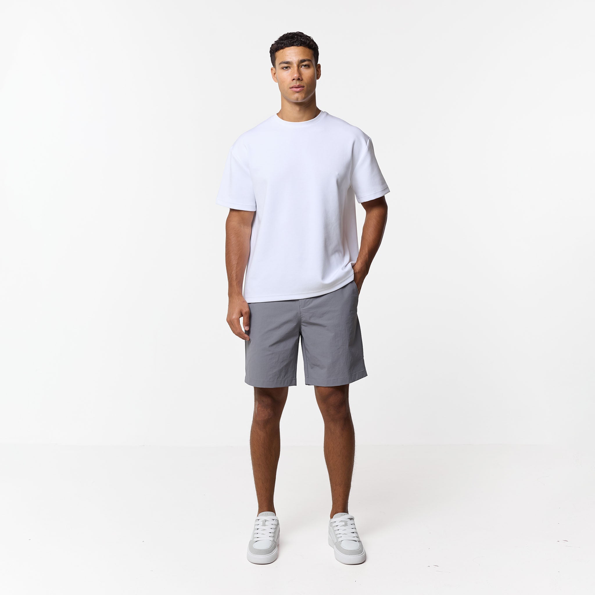 Introducing the new season Smart Tech Shorts in Mid Grey, delivering the ultimate blend of a sophisticated aesthetic with the functionality of modern performance gear. The innovative waistband is crafted with hidden elastic side panels and internal drawstrings to ensure a precise, adaptive fit that moves with you, complemented by standard belt loops for optional styling. Designed with a focus on a streamlined silhouette, these shorts feature a secure press stud and zip fly, deep slanted side pockets, and a clean rear welt pocket. A low-profile security pocket with an auto-lock zip keeps your valuables safe on the move, while the tonal stitching and signature Closure London metal badge provide a premium touch.