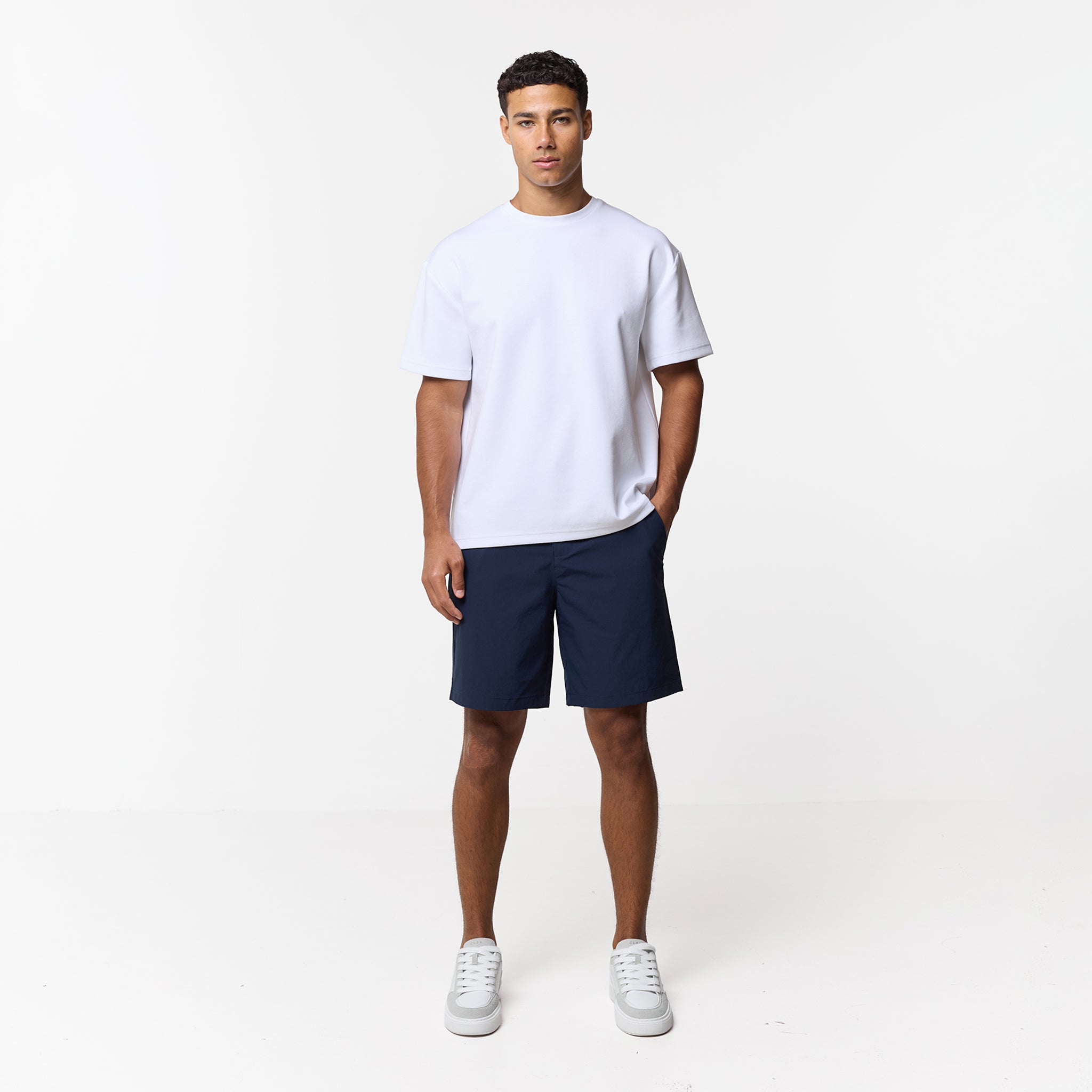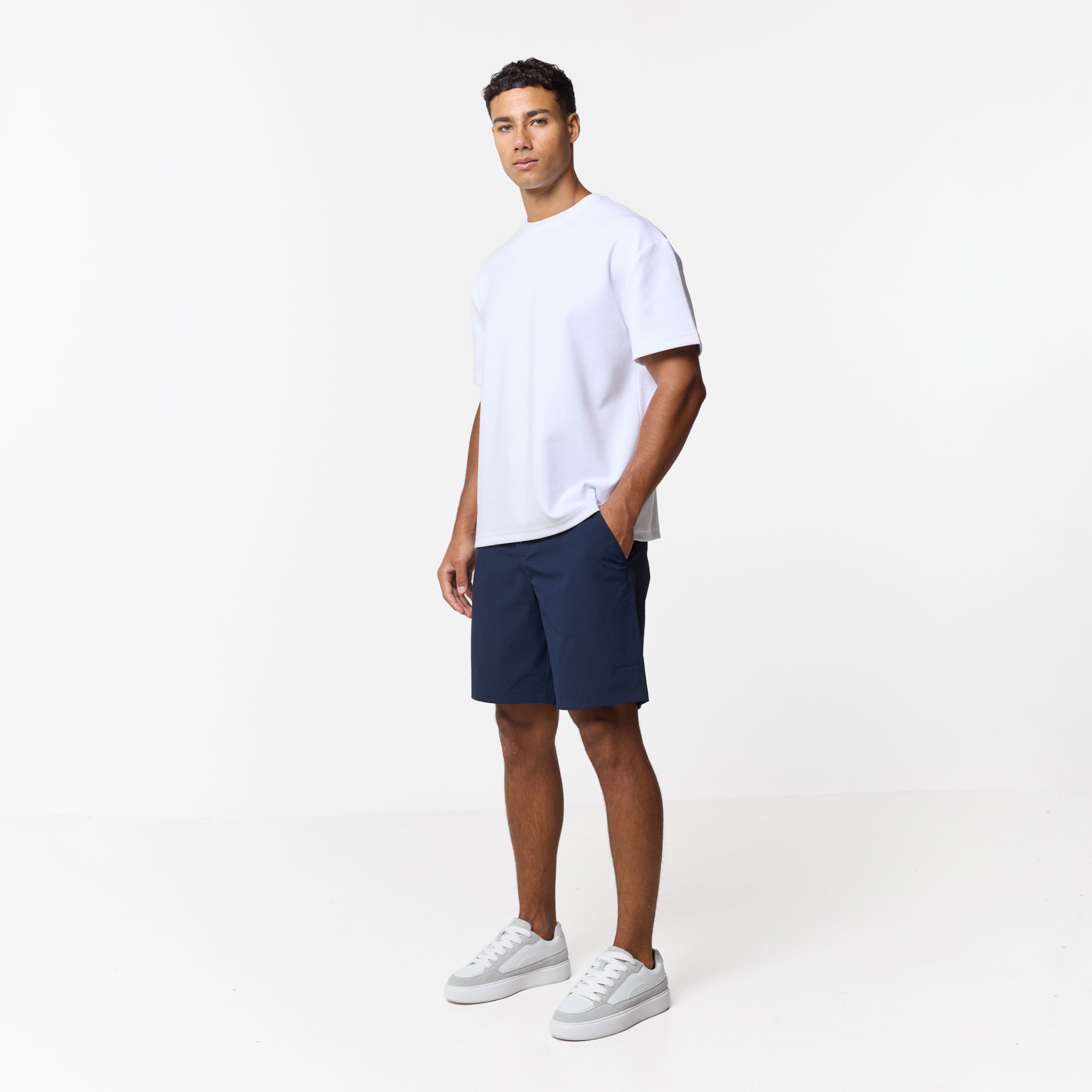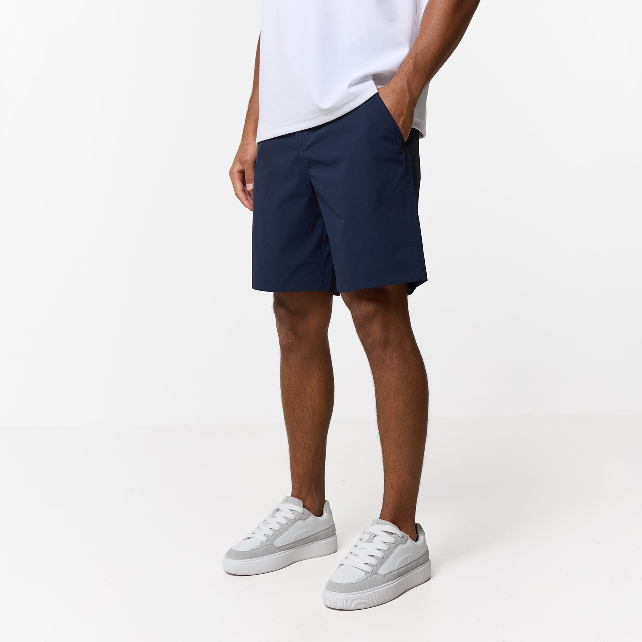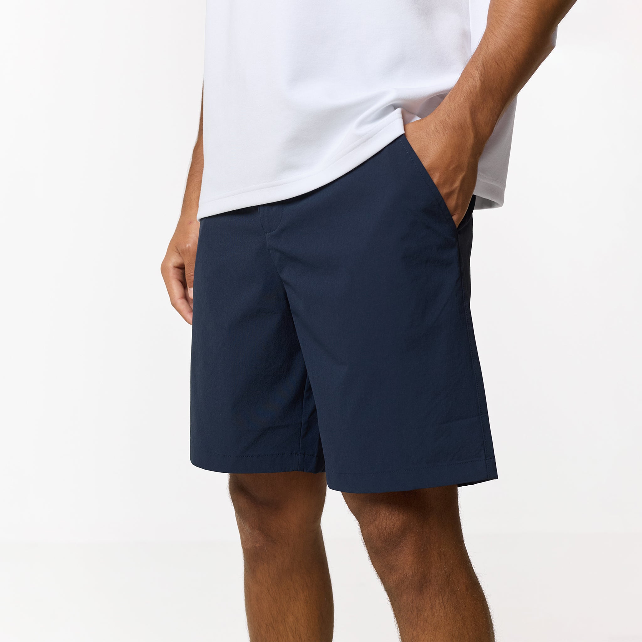 Elevate your rotation with a blend of technical precision and refined style, the Navy Smart Tech Shorts are the solution for those who demand both utility and a sharp profile. The waistband is thoughtfully engineered for an adaptive fit, combining hidden elasticated side sections and internal drawstrings with classic belt loops for total versatility. Every feature is meticulously considered, from the secure press stud and zip fly closure to the streamlined rear welt pocket and deep-set slanted front pockets. For active security, a discreet auto-lock zip pocket protects your essentials, while tonal stitching and the signature Closure London metal hardware provide a sophisticated finish.