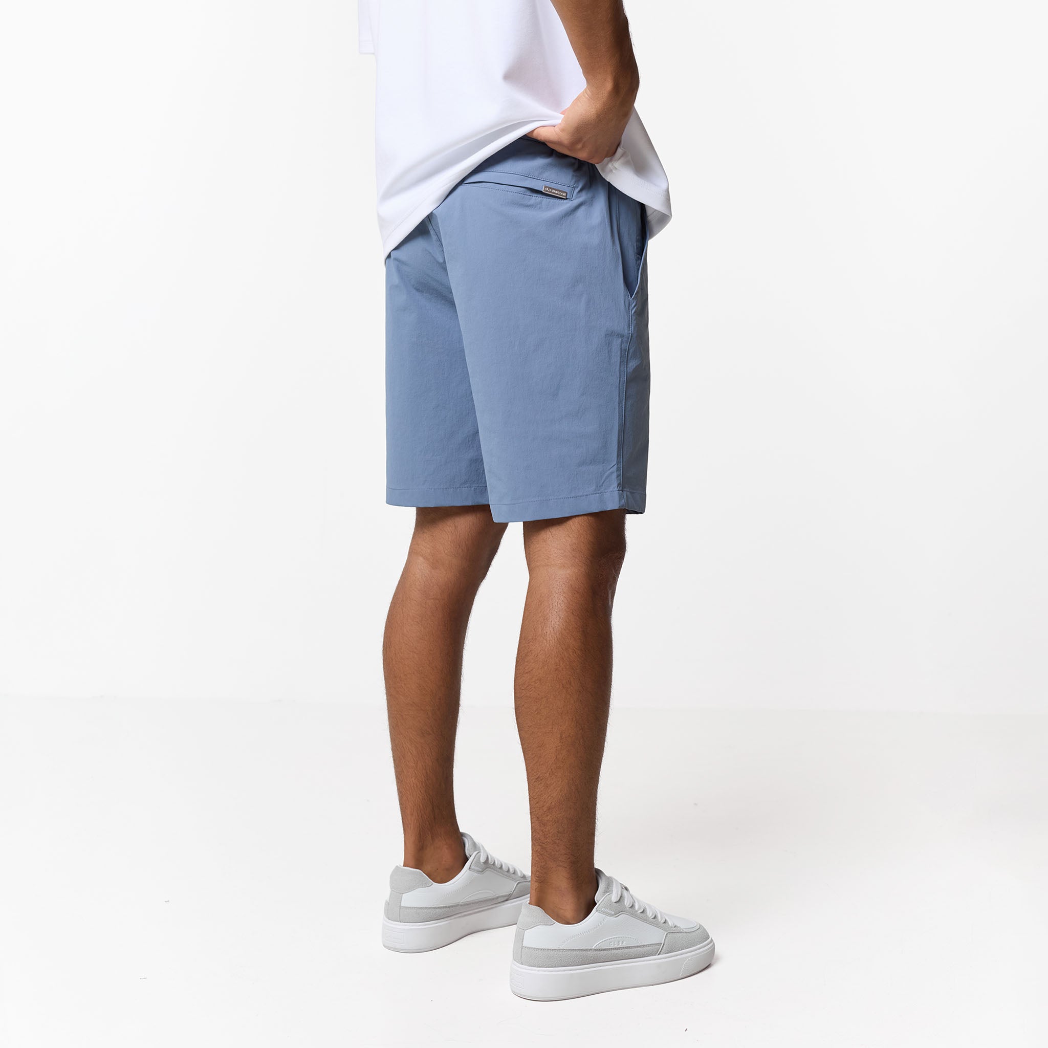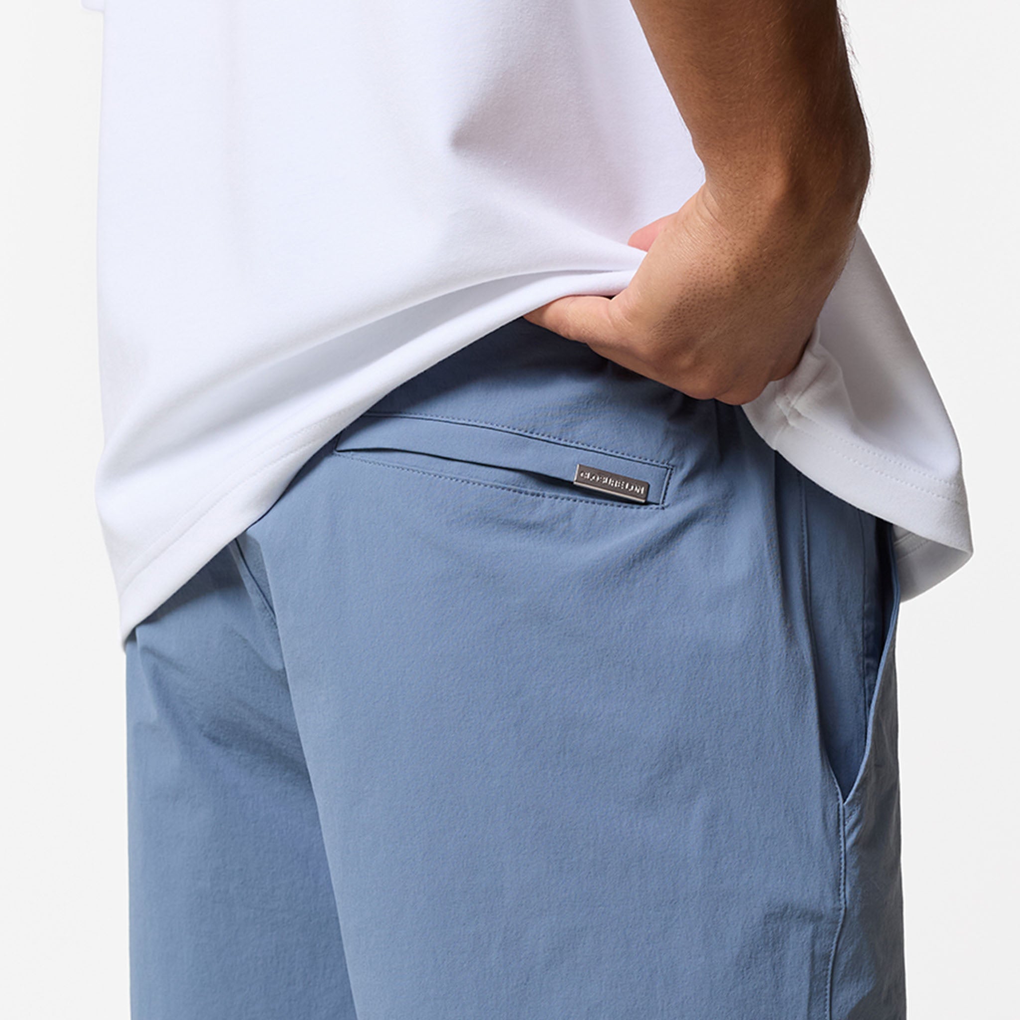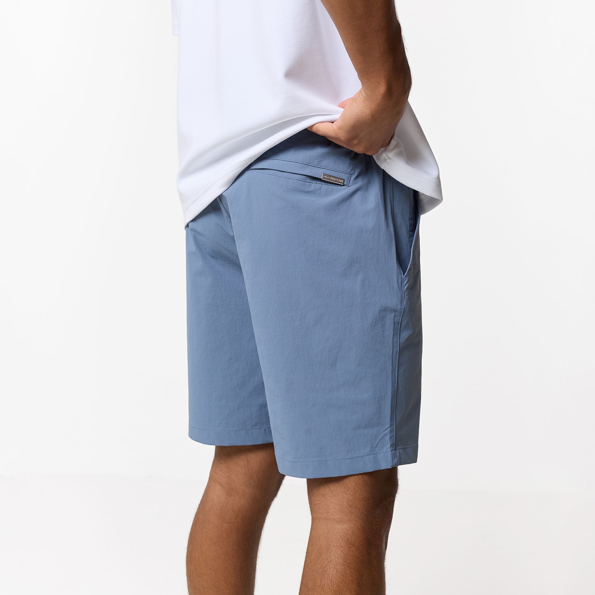 Achieve an effortless tailored silhouette with the Smart Tech Shorts in Steel Blue, built for those who demand both style and practical movement. The waistband is engineered for versatility, utilising elasticated side panels and internal flat drawcords alongside traditional belt loops for a personalised, secure fit. Every detail serves a purpose, from the reliable press stud and zip fly closure to the streamlined rear welt pocket and deep slanted side entries. A hidden autolock zip pocket offers a protected space for essentials, while the tonal stitching and signature Closure London metal hardware provide a sophisticated finish.