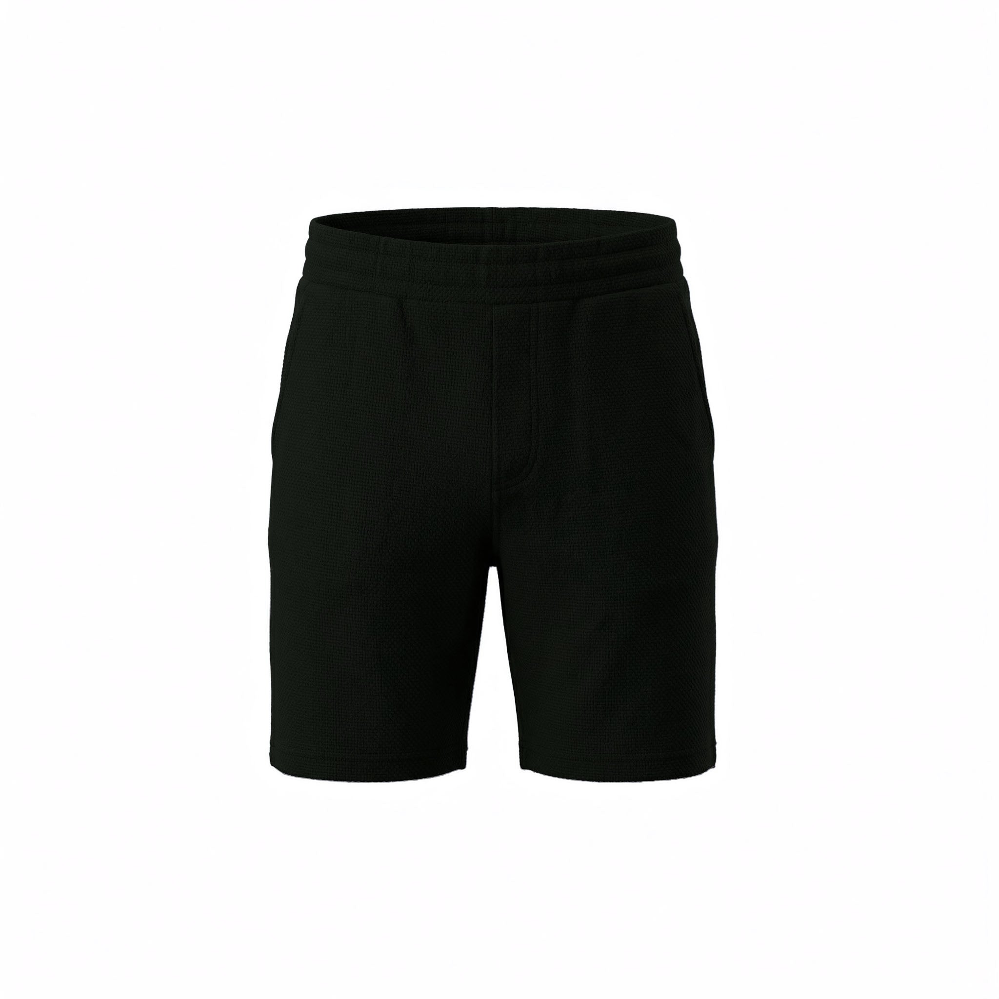 Upgrade your core collection with our Textured Shorts, in a deep black cotton jacquard that provides a rich, tactile approach to a classic silhouette. These shorts serve as a timeless foundational piece, effortlessly transitioning from day to night thanks to their substantial fabric and clean-lined design. Featuring a ribbed waistband with a concealed internal drawcord, a structured faux fly, and traditional back welt accents, they offer the polished aesthetic of a trouser with the ease of loungewear. Finished with signature metal hardware and reinforced stitching, the monochromatic black palette ensures maximum versatility.