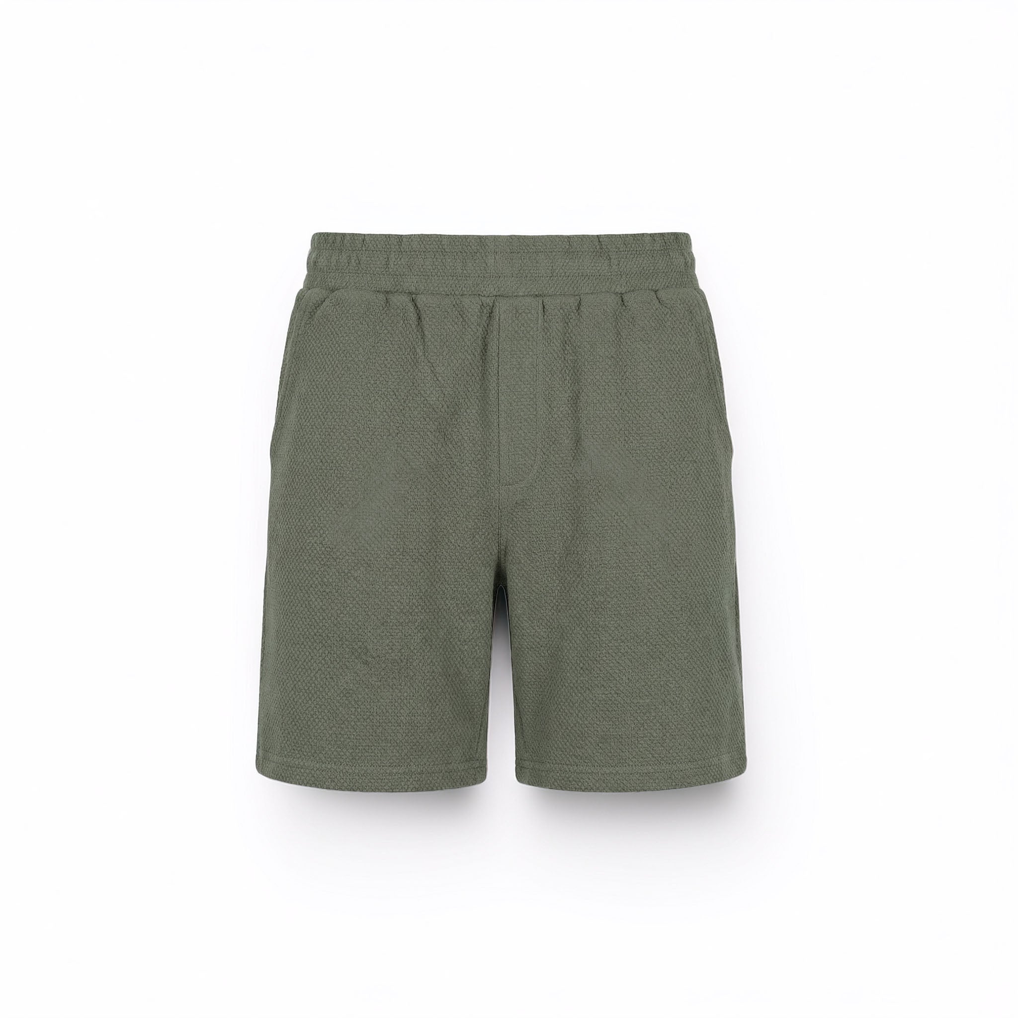 Introducing the new season Textured Shorts in a rich olive shade, expertly crafted from heavyweight pure cotton jacquard for a premium, tactile finish. Designed to bridge the gap between relaxed resort wear and a tailored aesthetic, they feature a sleek rib waistband with a hidden internal drawcord alongside a faux fly and back welt details. Finished with functional slant pockets, durable twin-needle stitching, and the signature Closure London metal badge, these shorts offer a sophisticated take on effortless everyday comfort.