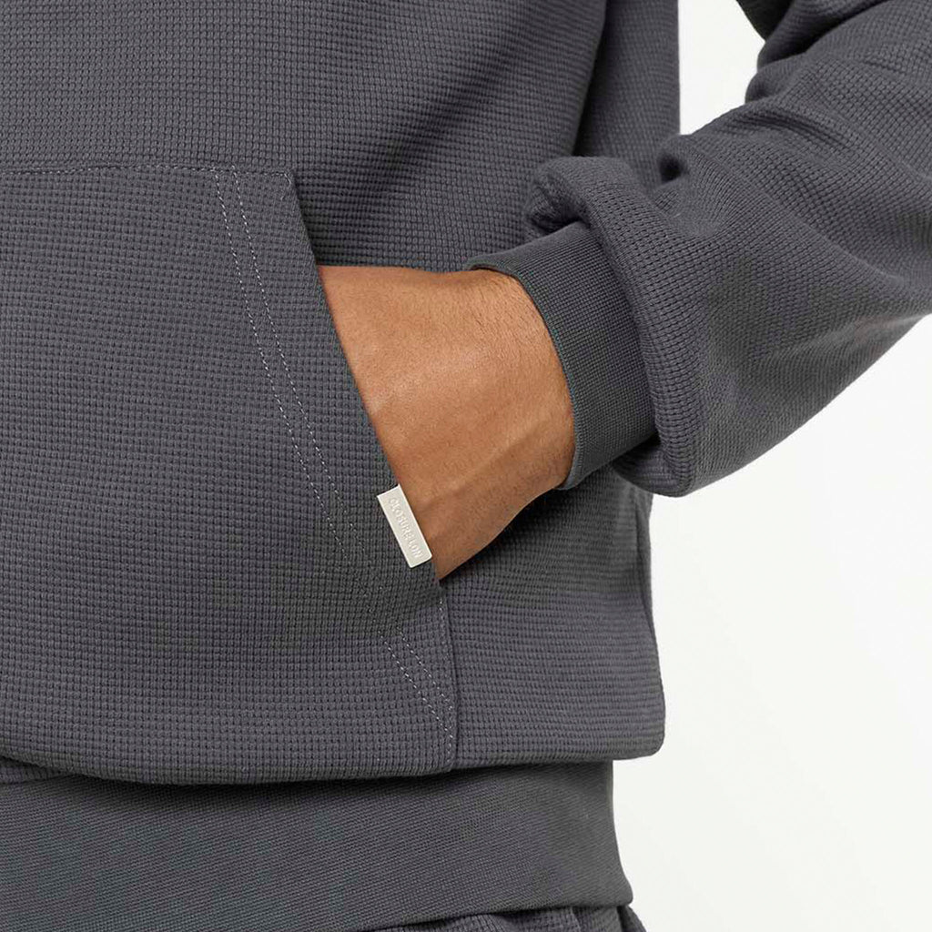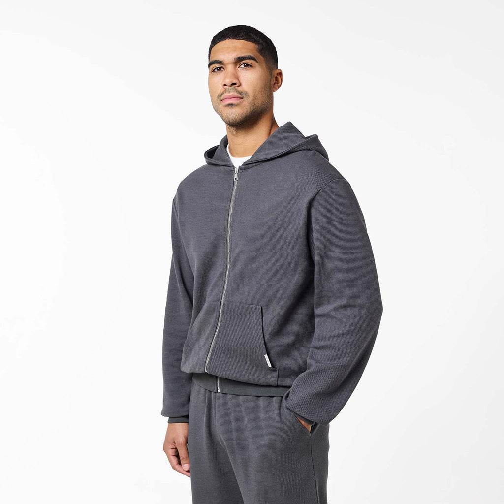 Experience the perfect blend of comfort and style with the Waffle Knit Full Zip Tracksuit in charcoal. Crafted from a soft, textured waffle fabric, this set provides exceptional comfort for any casual occasion. The hoodie boasts a cosy lined hood with neck tape, a secure full zip front fastening using a sleek gunmetal zipper, and a spacious kangaroo pocket featuring a Closure London branded metal tab. Ribbed cuffs and hem ensure a neat, comfortable silhouette. The matching joggers are designed with a modern open hem fit, a flexible ribbed waistband with flat internal drawcords, and convenient slant pockets adorned with a Closure London branded metal tab. Two rear welt pocketscomplete the practical design, making this set ideal for both unwinding and looking sharp.