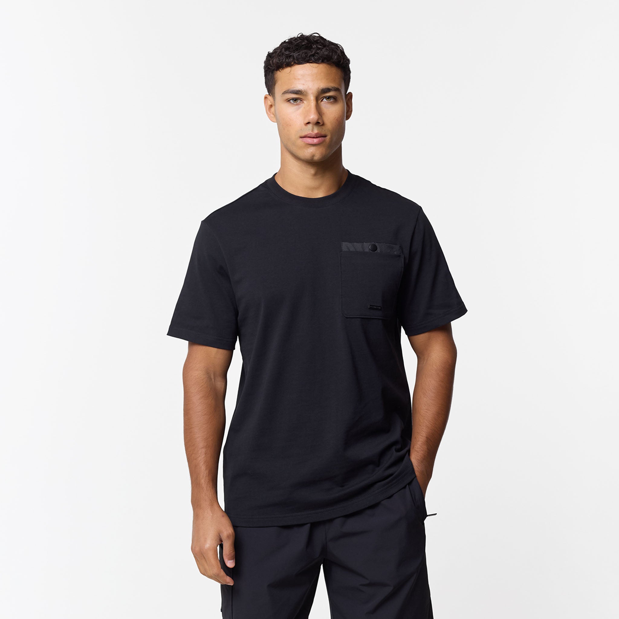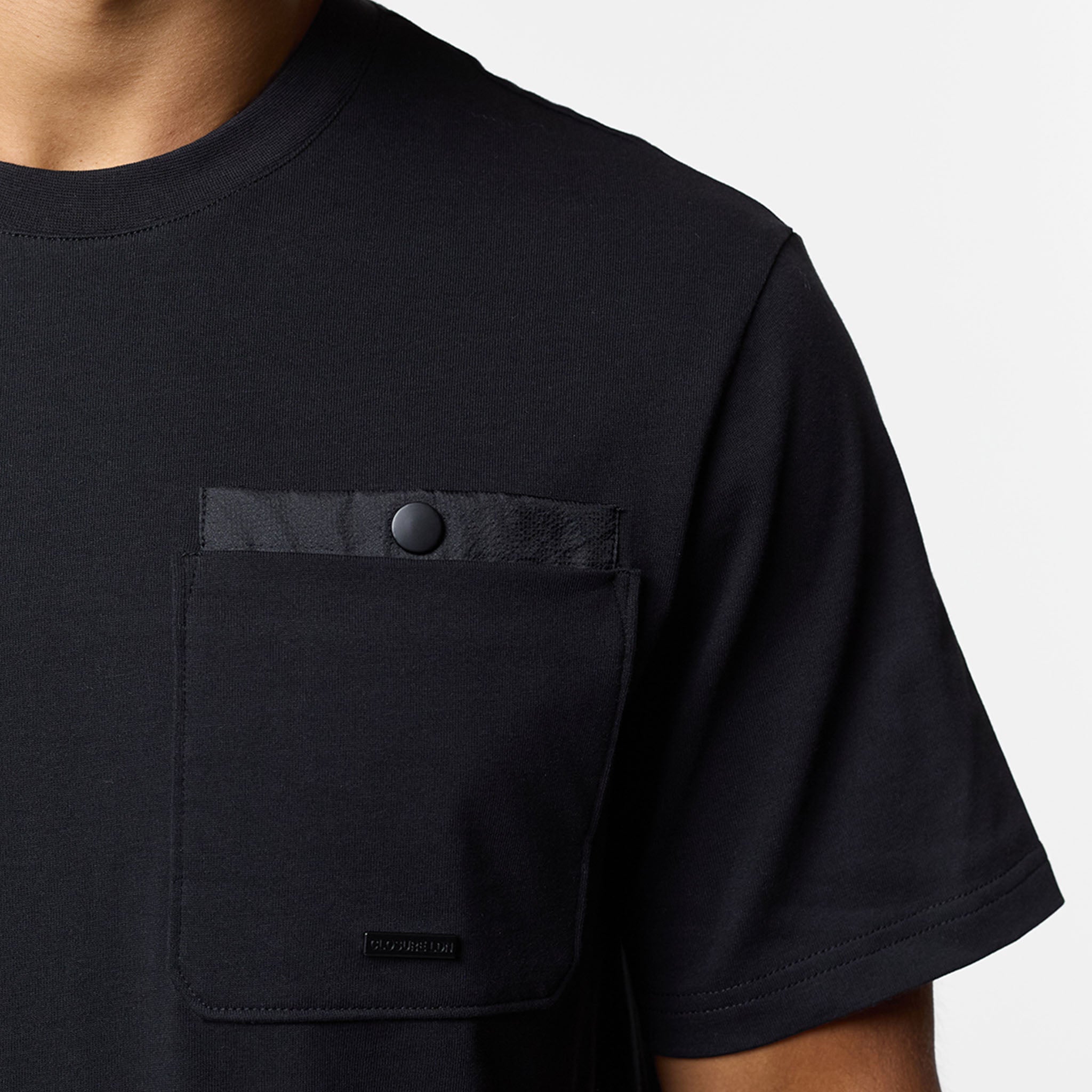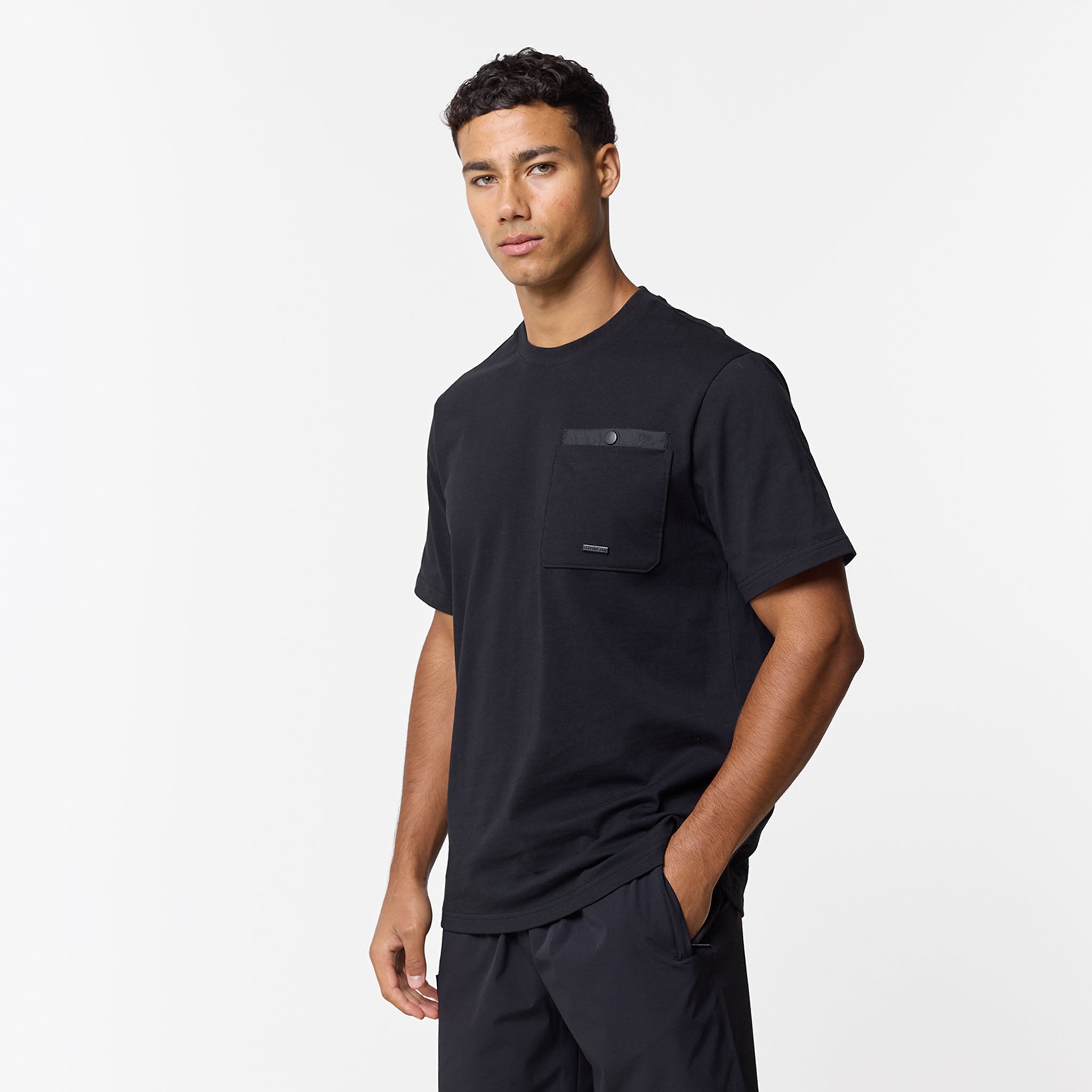 Step up your everyday rotation with this essential yet elevated Double Pocket Tech T-Shirt in black. Designed in a timeless regular fit with a comfortable crew neck and short sleeves, this piece effortlessly blends casual ease with structured utility. The defining feature is the striking double layered chest patch pocket, which secures your essentials with a reliable press stud fastening and is subtly complimented by our Closure branded metal badge. Expertly constructed for lasting comfort, details like the internal neck tape and clean neck trim ensure a premium feel against the skin. A core piece of our collection, designed to perfectly coordinate with the matching Double Pocket Tech overshirt and shorts for a streamlined look. Or switch up your look and pair with your the matching pants.
