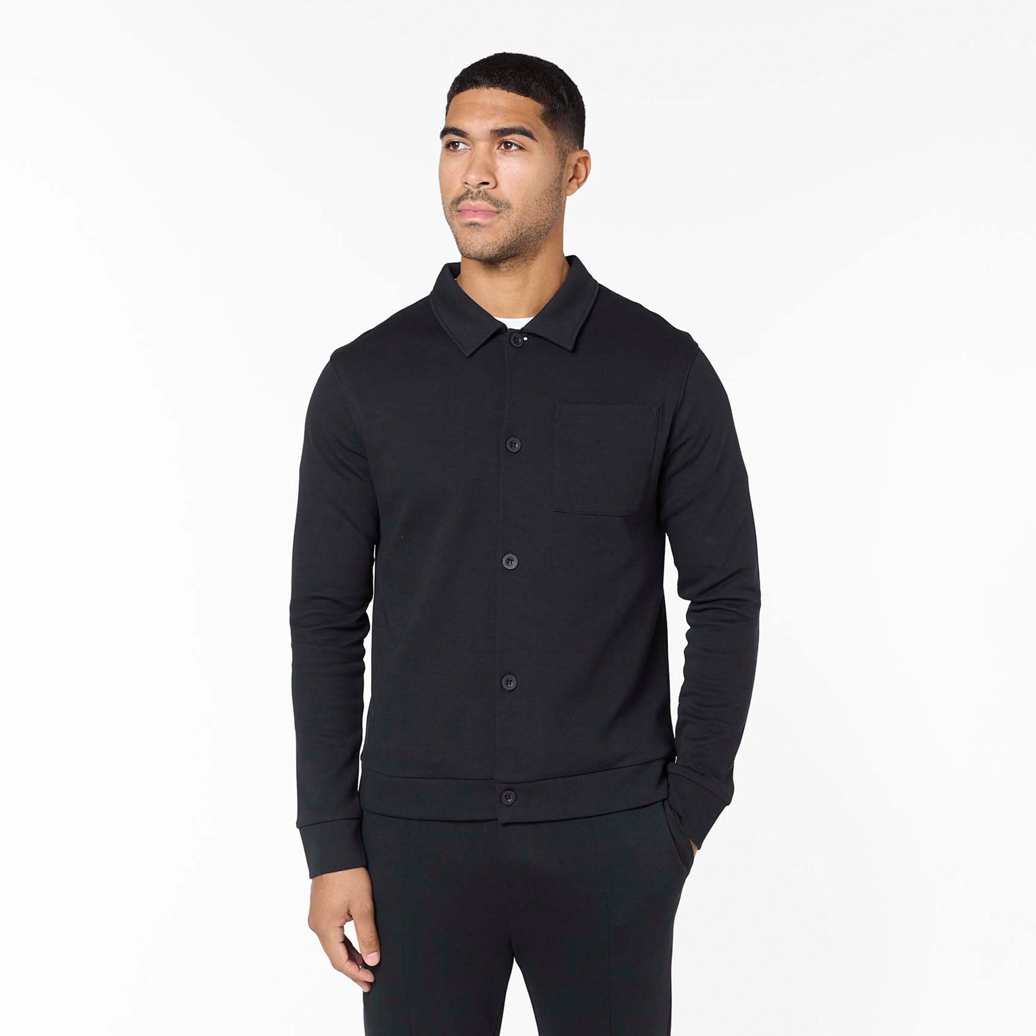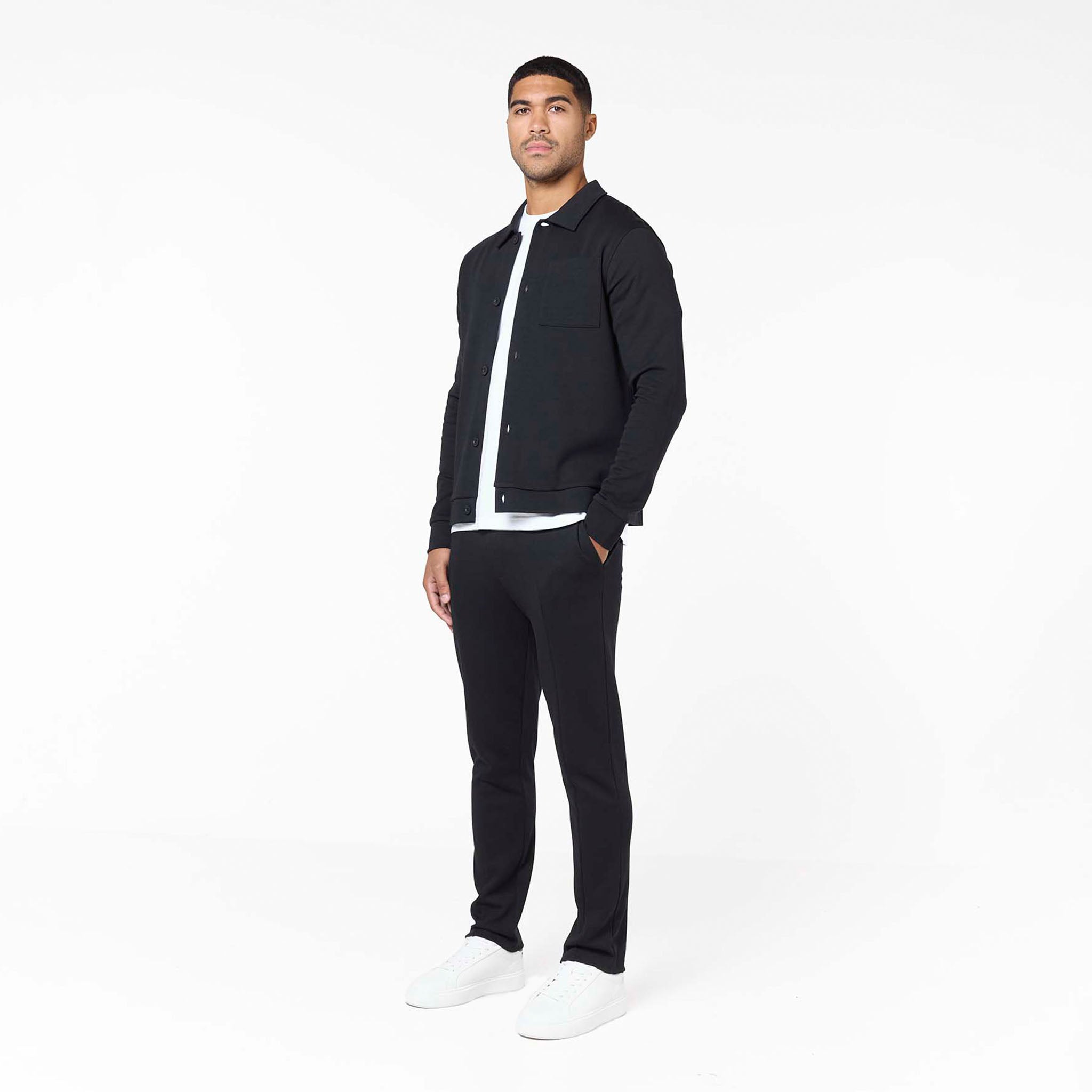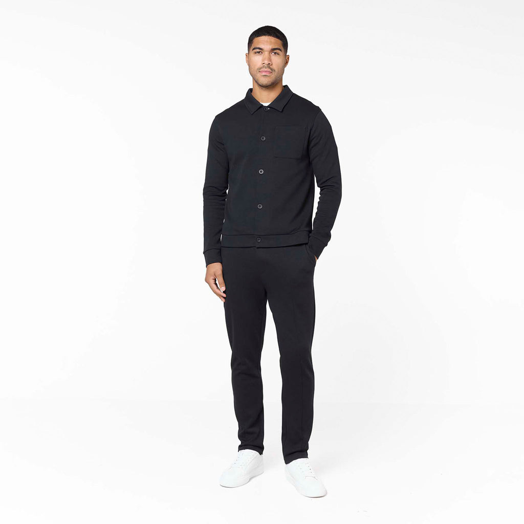 Discover ultimate sophisticated comfort with the Interlock Set in black, your go-to for elevated everyday wear. This meticulously crafted set includes the Interlock Button Up Jacket, boasting a crisp self-fabric collar, precise edge stitching, and Closure LDN branded buttons for a refined finish. Complementing it are the Interlock Smart Slim Fit Joggers, engineered for a modern, tapered fit with a clean open hem, flat internal drawcords, and convenient slant pockets. Both pieces feature thoughtful details like a rear metal branded badge on the jacket and subtle faux zip fly stitching on the joggers, ensuring premium comfort and enduring style.