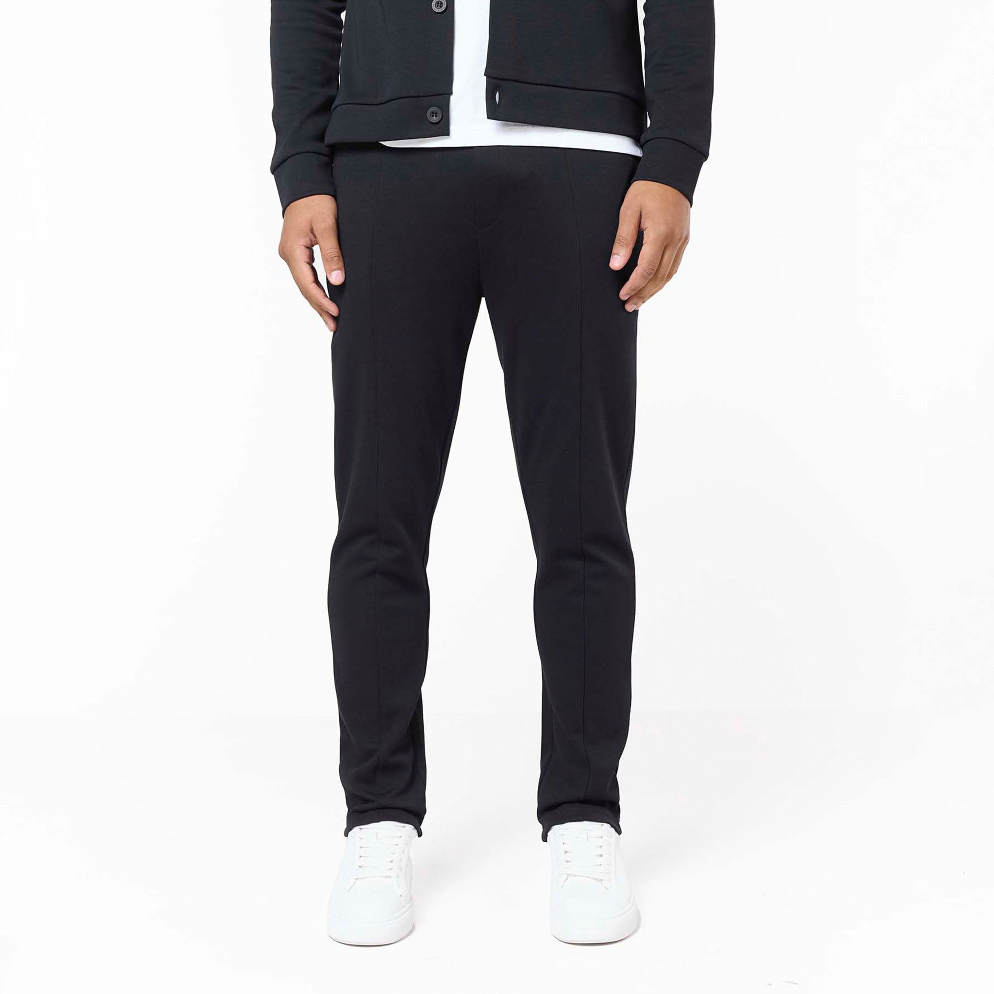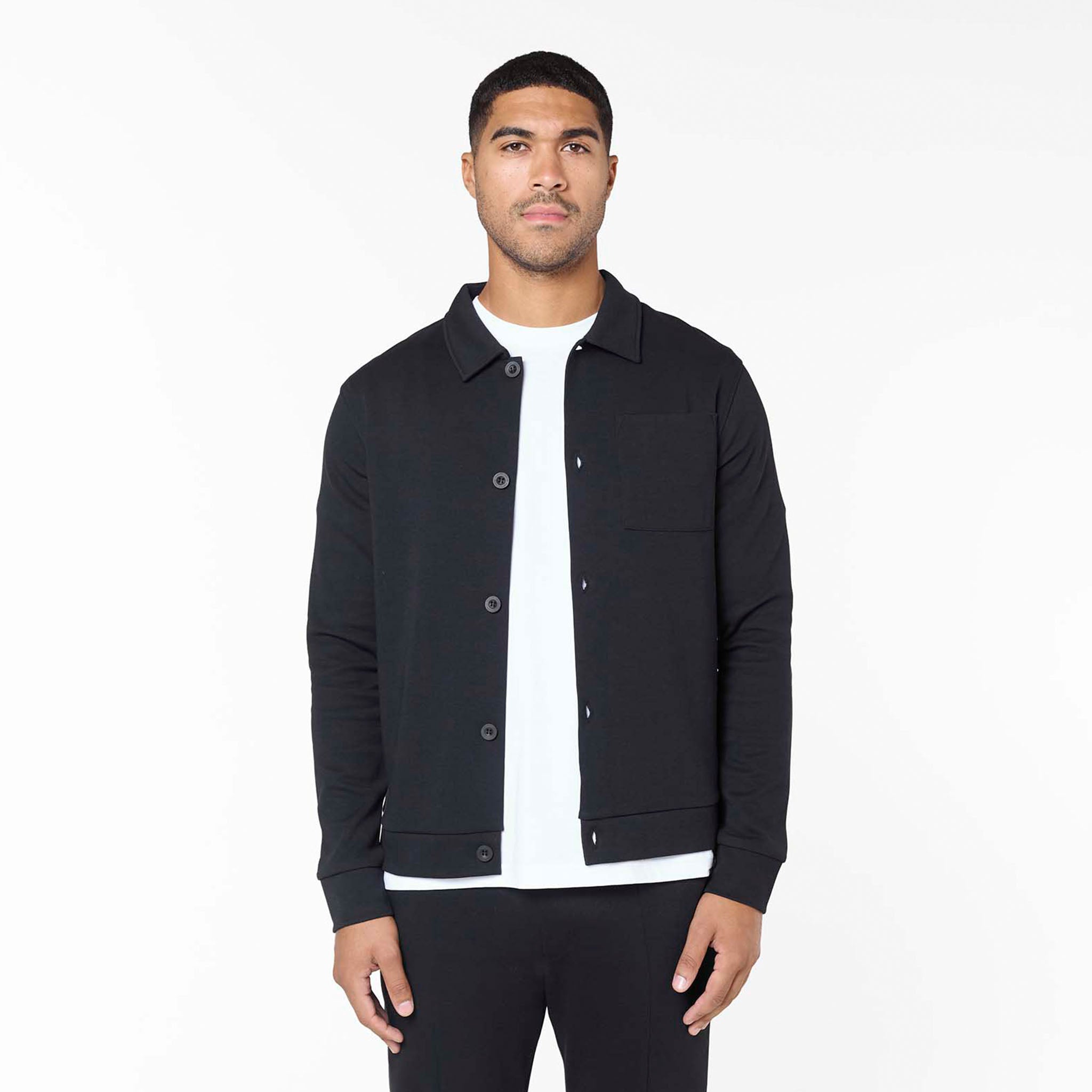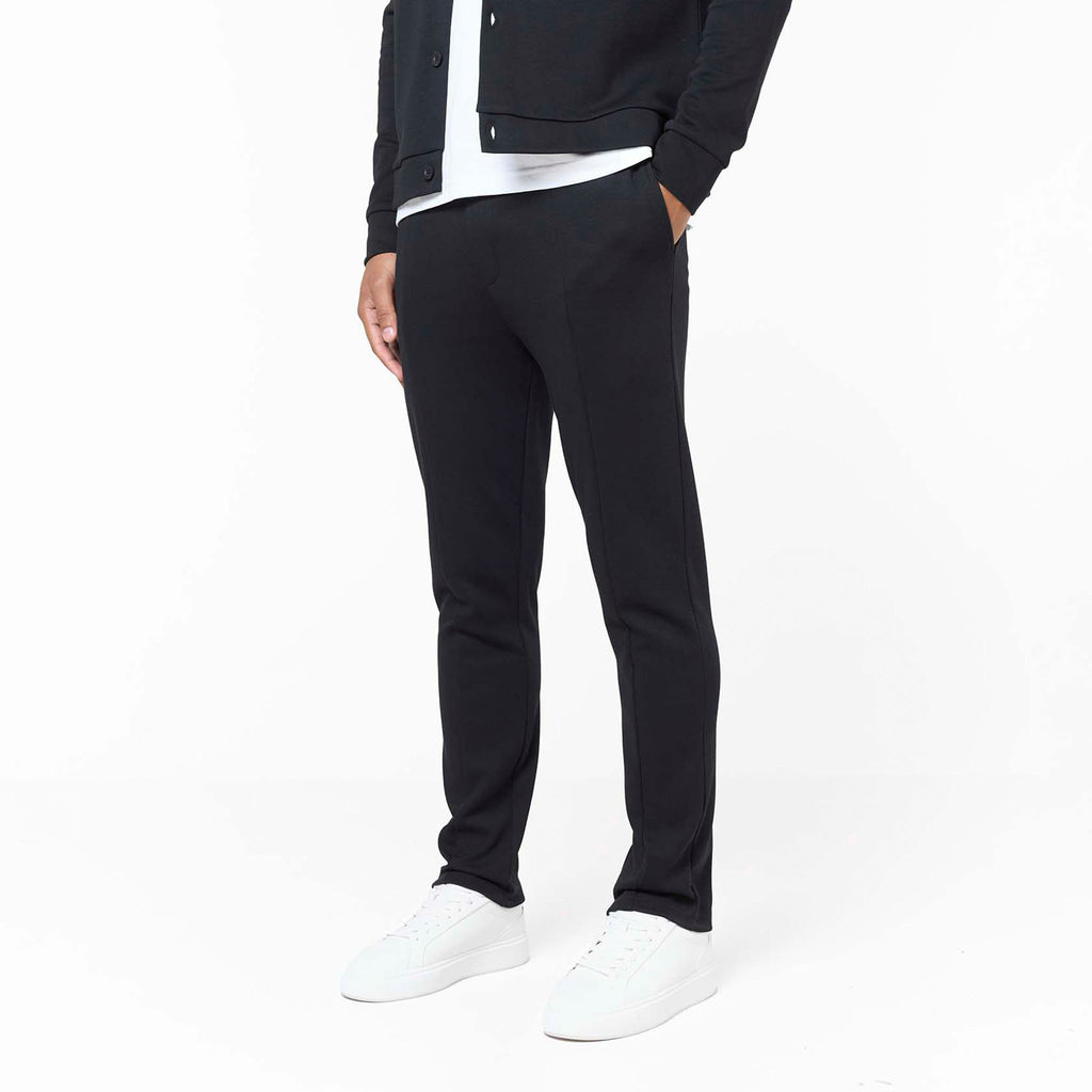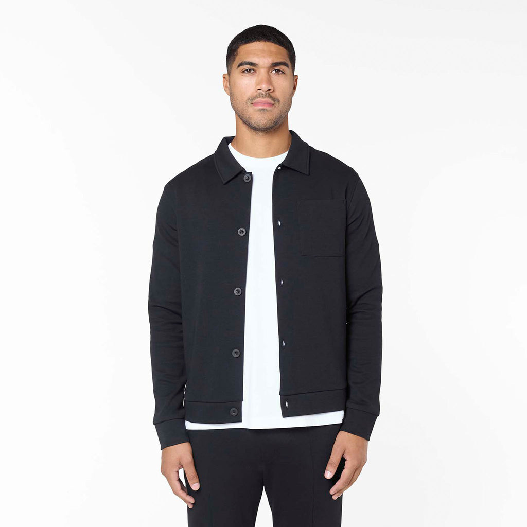 Discover ultimate sophisticated comfort with the Interlock Set in black, your go-to for elevated everyday wear. This meticulously crafted set includes the Interlock Button Up Jacket, boasting a crisp self-fabric collar, precise edge stitching, and Closure LDN branded buttons for a refined finish. Complementing it are the Interlock Smart Slim Fit Joggers, engineered for a modern, tapered fit with a clean open hem, flat internal drawcords, and convenient slant pockets. Both pieces feature thoughtful details like a rear metal branded badge on the jacket and subtle faux zip fly stitching on the joggers, ensuring premium comfort and enduring style.