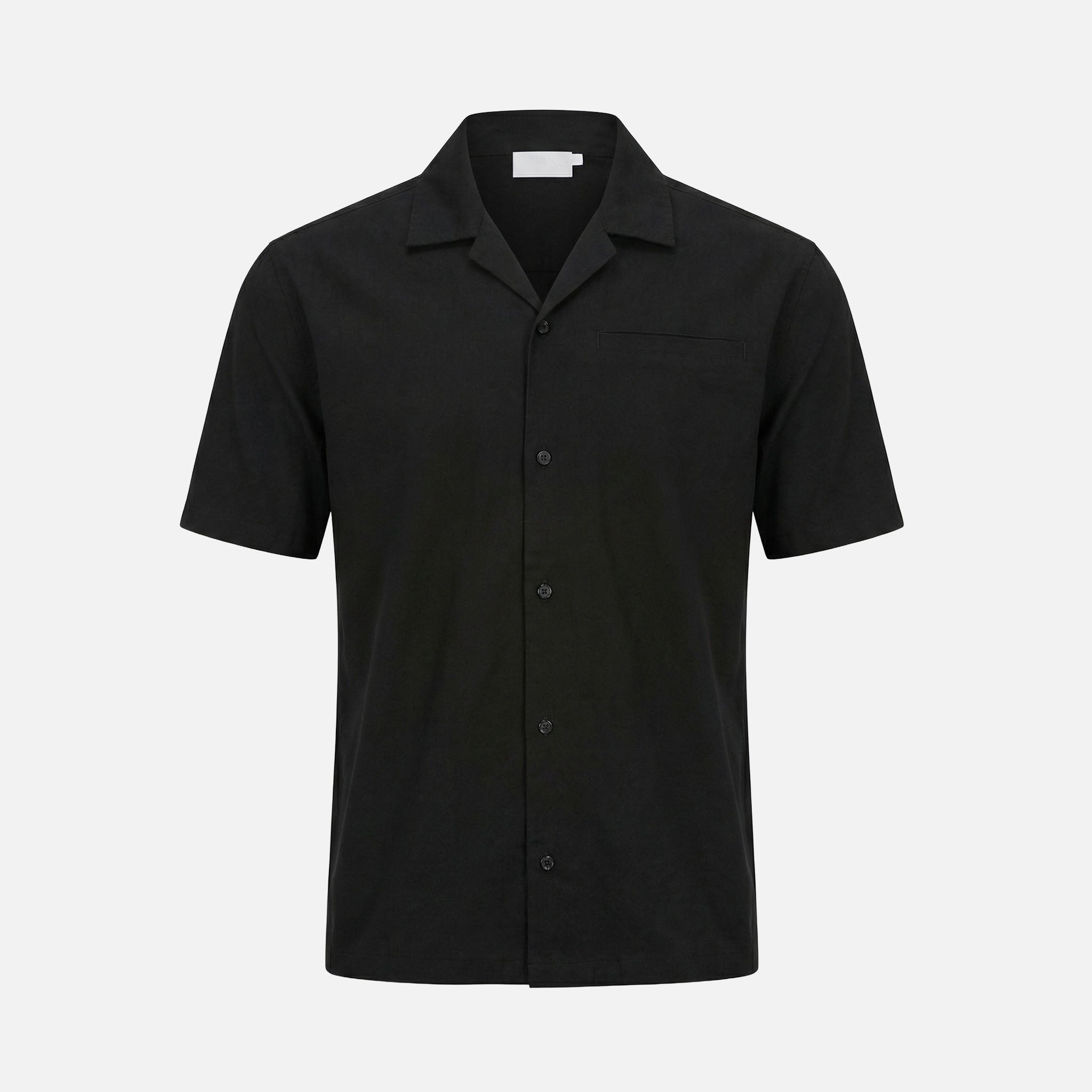 Introducing the Linen Blend Shirt in timeless black, a cornerstone piece for the ultimate summer wardrobe. This short-sleeved silhouette delivers an impeccable drape, ensuring comfort without compromising on structure. The design is distinguished by a tailored revere collar and forward-set shoulders, creating a sharp, profile that is reinforced by a seamless front placket and a signature welt pocket with metal hardware. Meticulously finished with self-turn cuffs and a twin-needle hem, this shirt serves as a versatile staple for any ensemble; style it as a standalone statement or coordinate it with our matching trousers or shorts for a sophisticated, monochromatic set.
