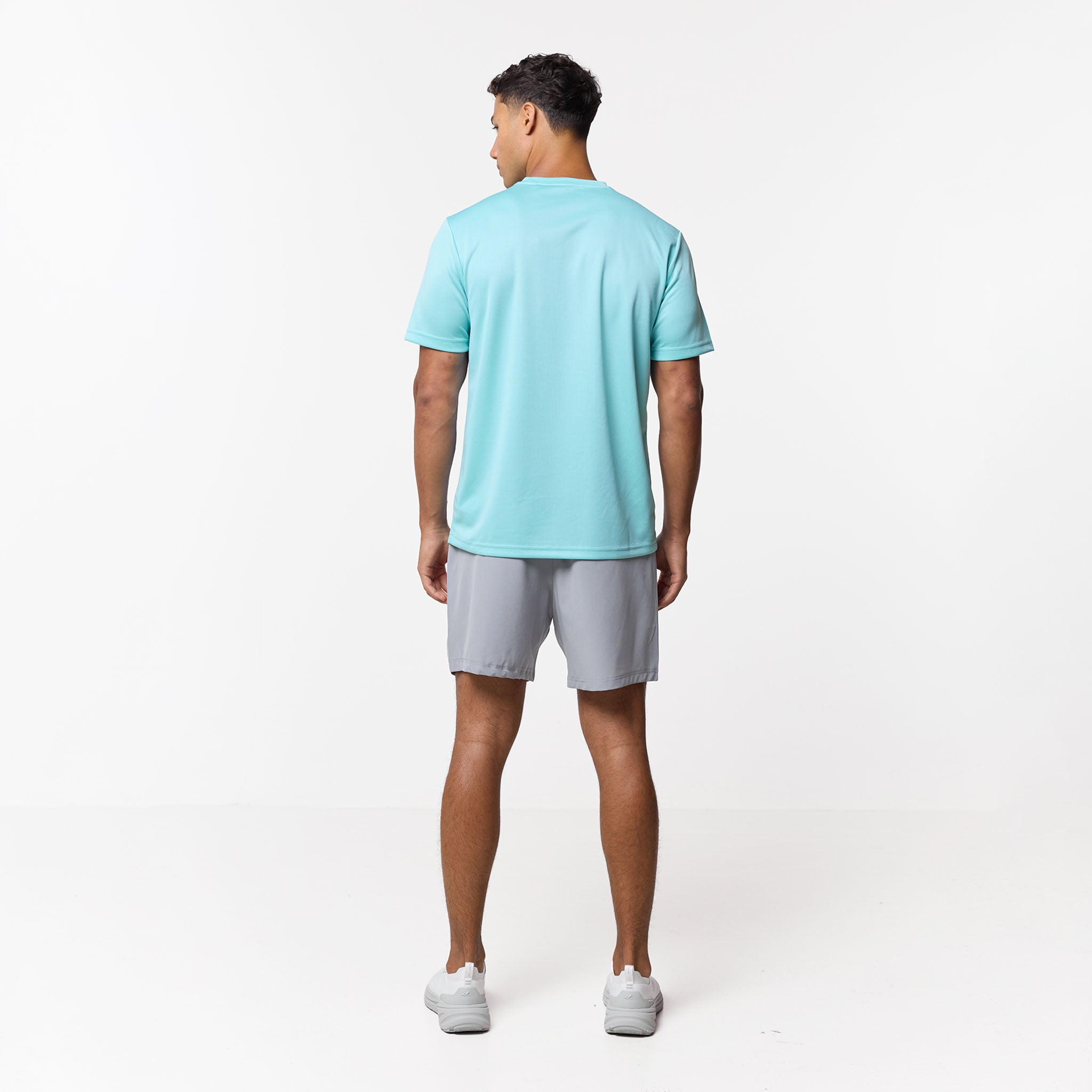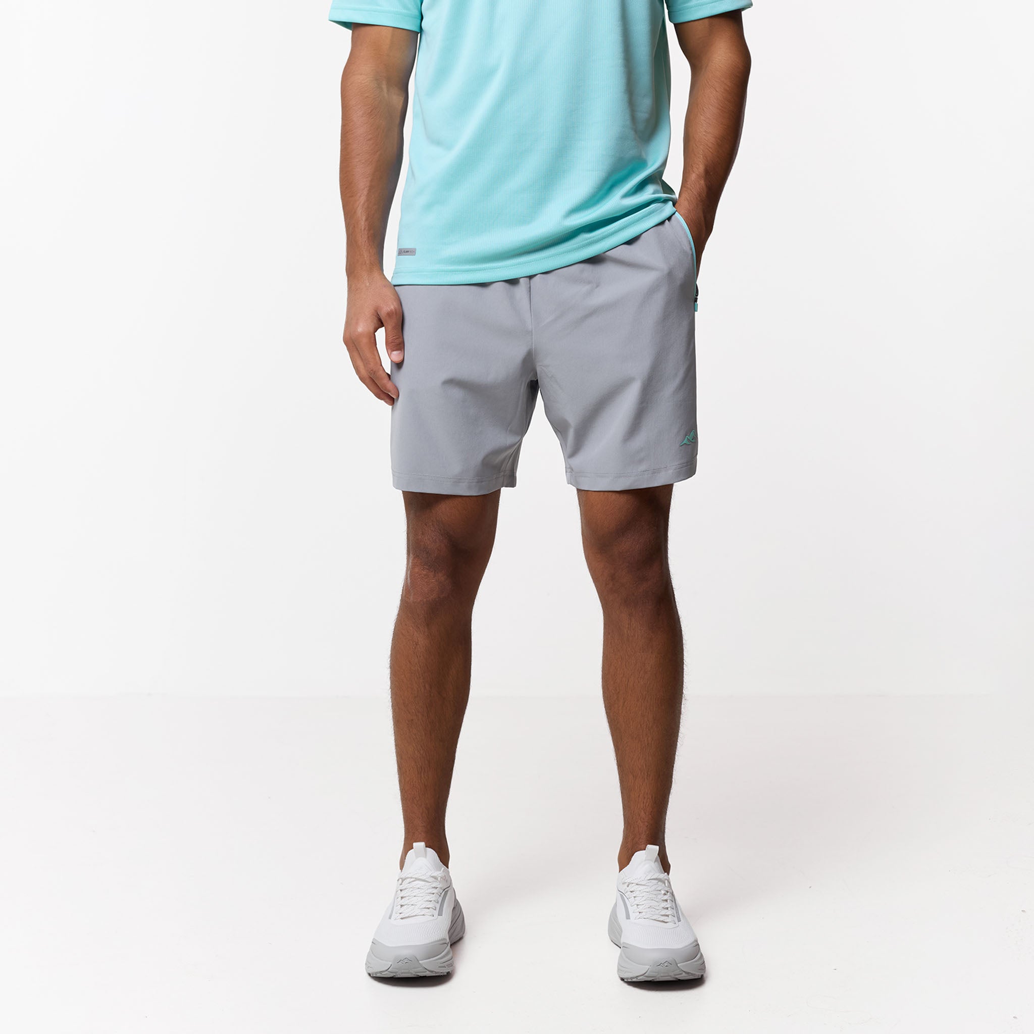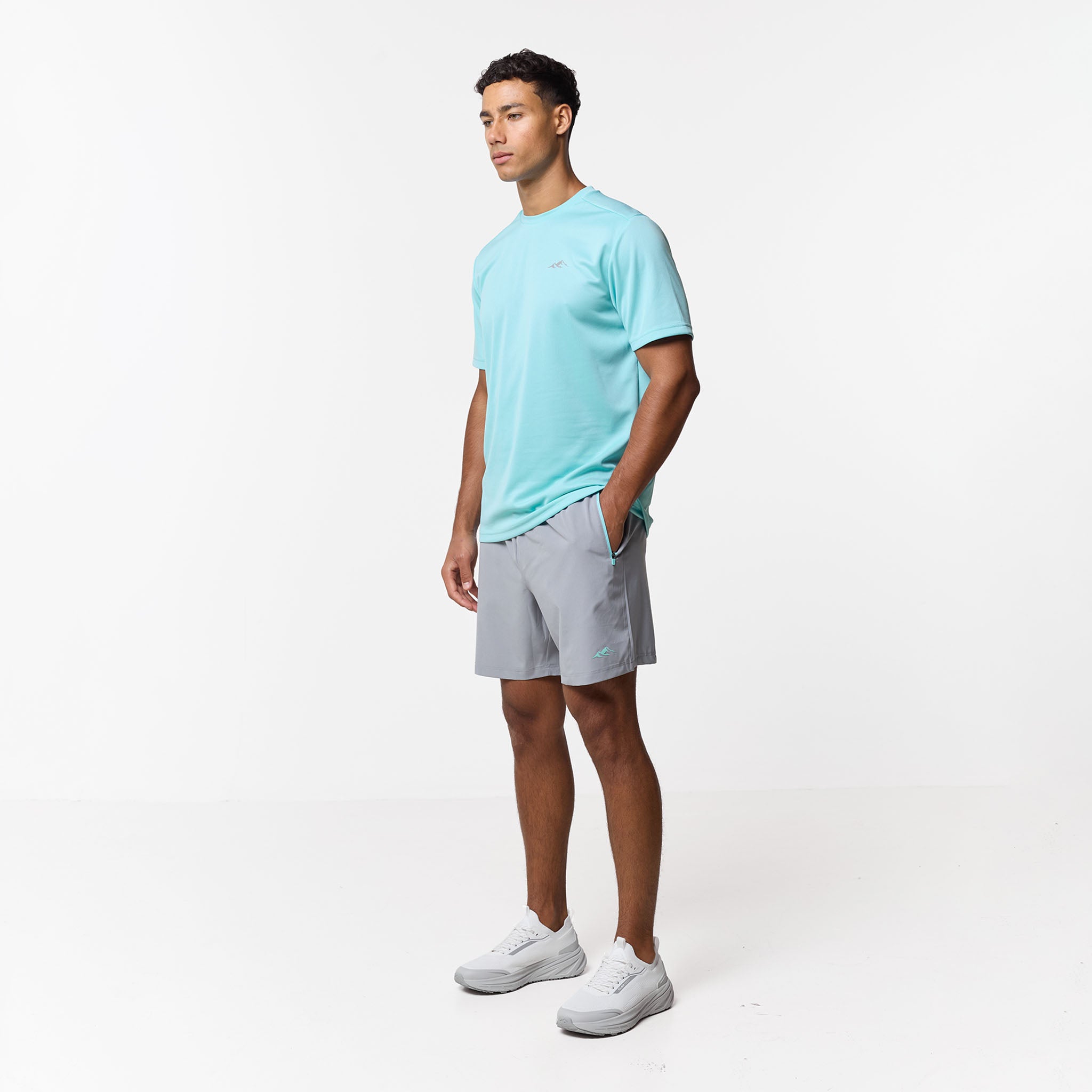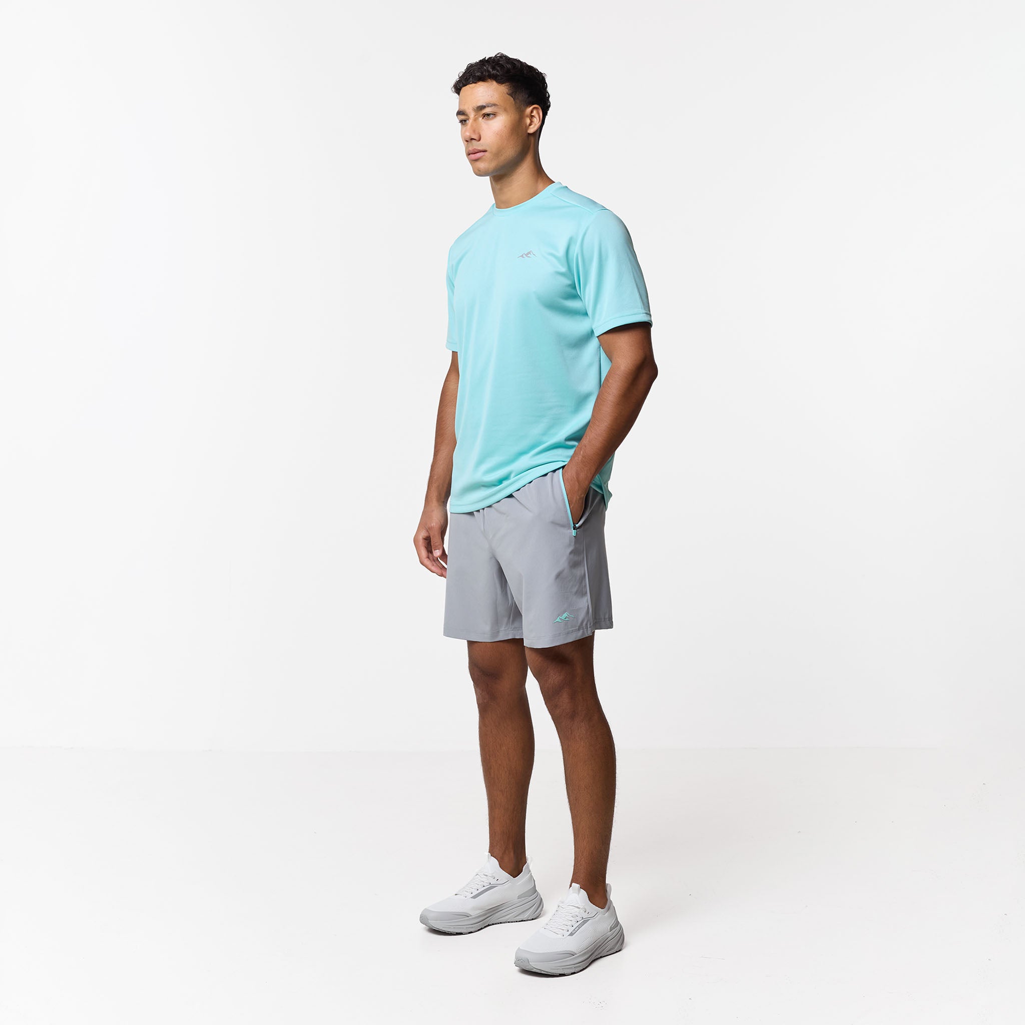 Refresh your workout rotation with the Pace Performance Twinset in Aqua Blue/ Ice Grey, a high-performance pairing designed to blend technical aesthetics with a cool, sharp aesthetic. This set leads with a regular-fit tee engineered from an elite poly-mesh that serves as a high-speed moisture-management system; its rapid-dry fabric keep you locked in and dry, while the striking Aqua Blue tone provides a vibrant look. Matched with Ice Grey performance shorts, built for a secure, custom feel with a flexible elasticated waistband and internal drawcords finished with rugged, rubber-dipped toggles. To maximise utility, the contrast pockets are fitted with reverse nylon coil zippers and auto-lock pulls to keep your essentials secure, while the industrial twin-needle hem stitching ensures a durable, premium finish that stands up to the rigours of daily training.