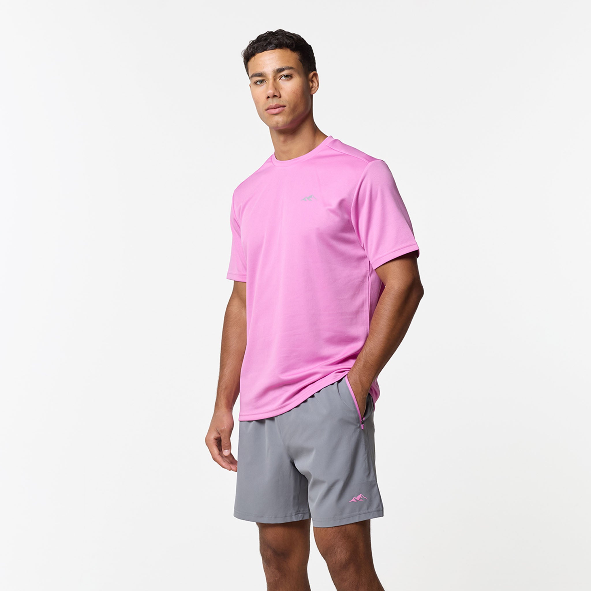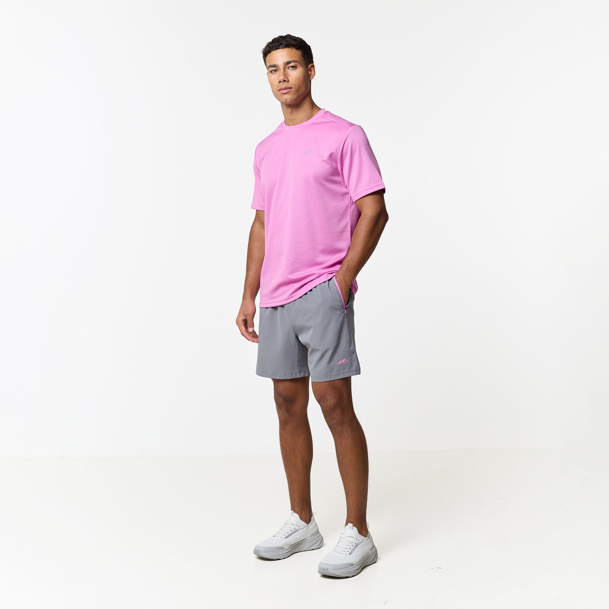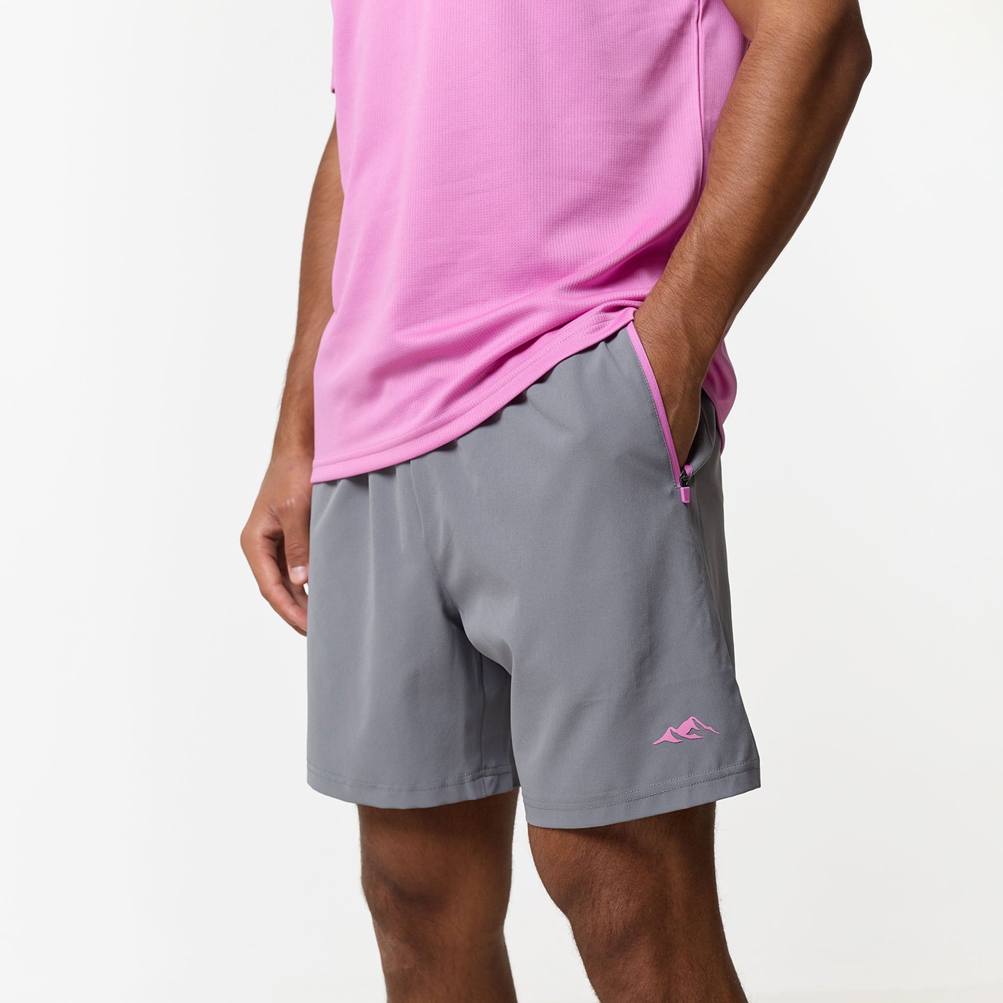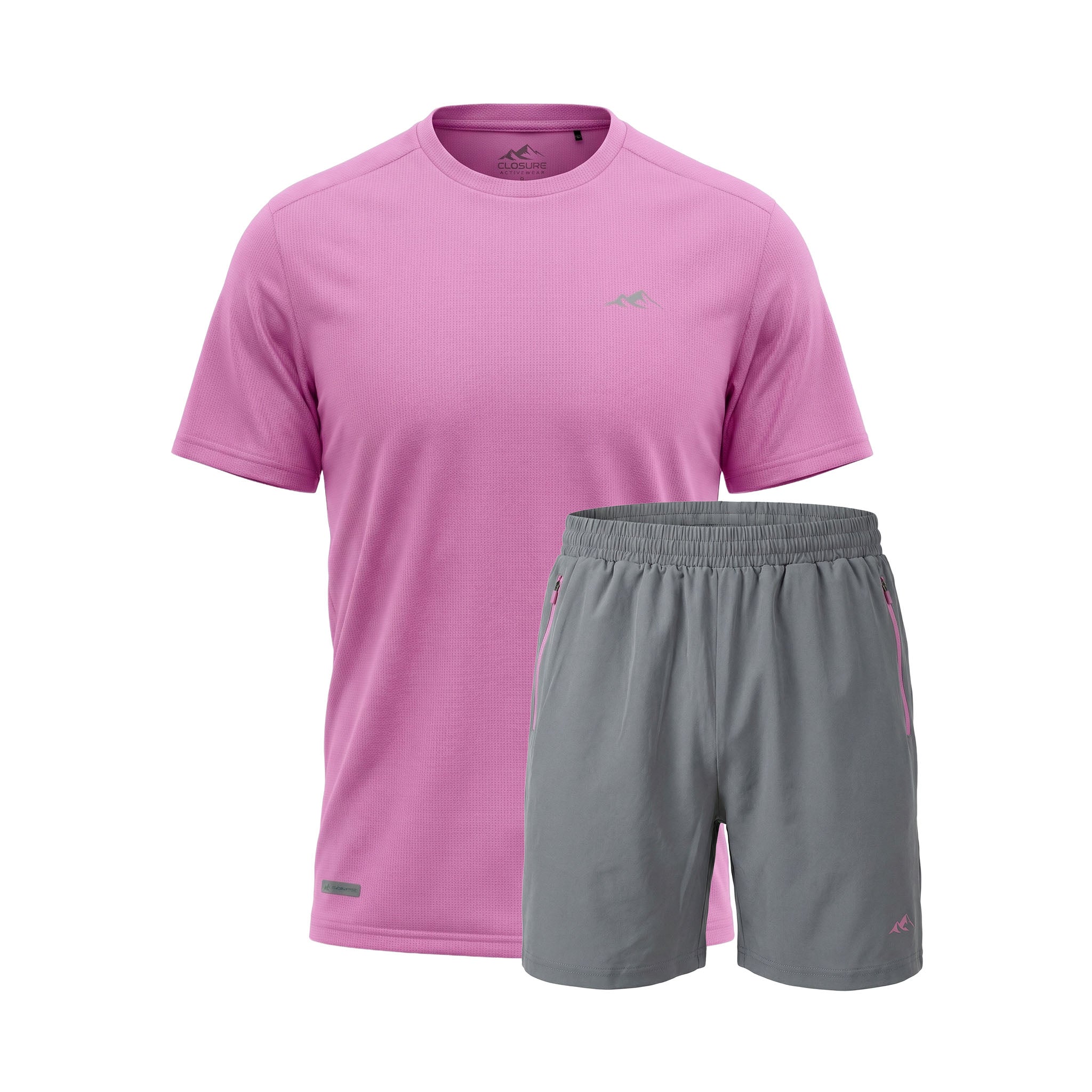 Redefine your training aesthetic with the CLSR Tech Twinset in a bold Pink and Iron Grey, built to bridge the gap between workouts and elevated everyday wear. The set features a regular-fit tee cut from an elite, poly-mesh with advanced moisture-management and rapid-dry ensure you stay focused while the vibrant pink hue makes a statement. Completing the set is the Iron Grey performance shorts, engineered for a locked-in feel with an elasticated waist and internal drawcords capped with heavy-duty rubber tips. Designed with a focus on utility, the contrast-panelled pockets feature reverse nylon coil zippers and auto-lock pulls, while the twin-needle stitching guarantees a resilient finish that outlasts your toughest sessions.