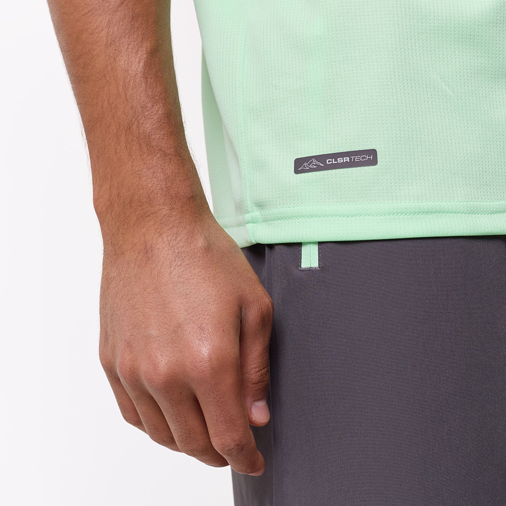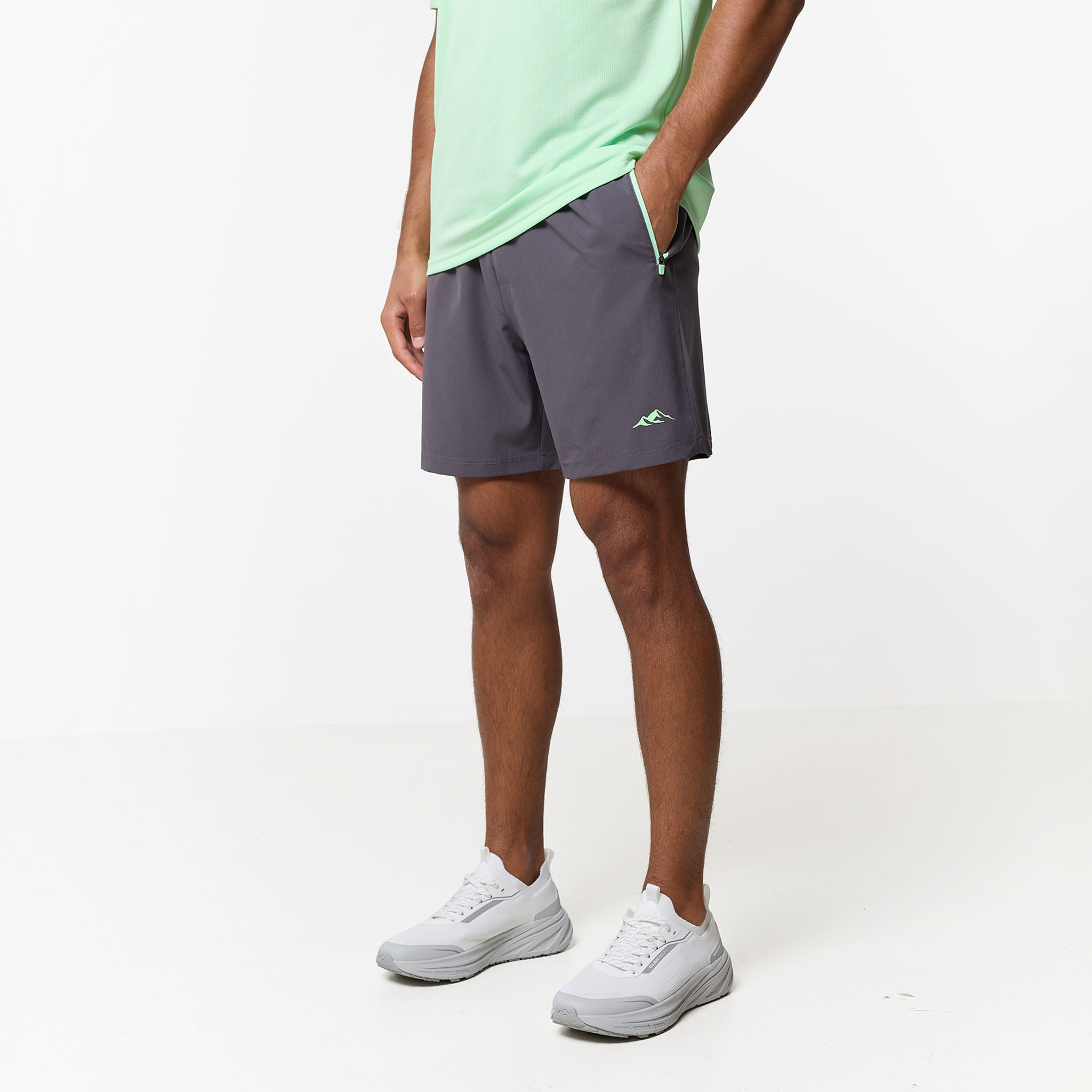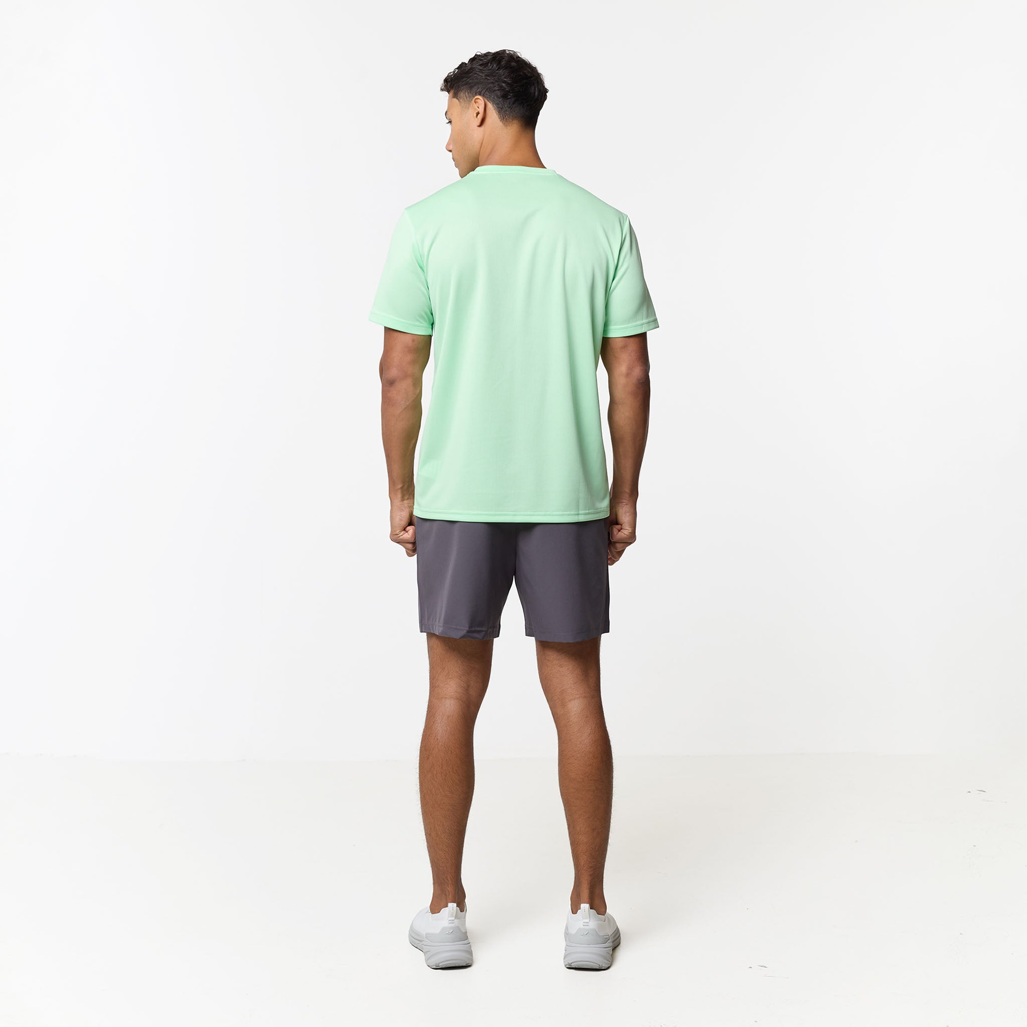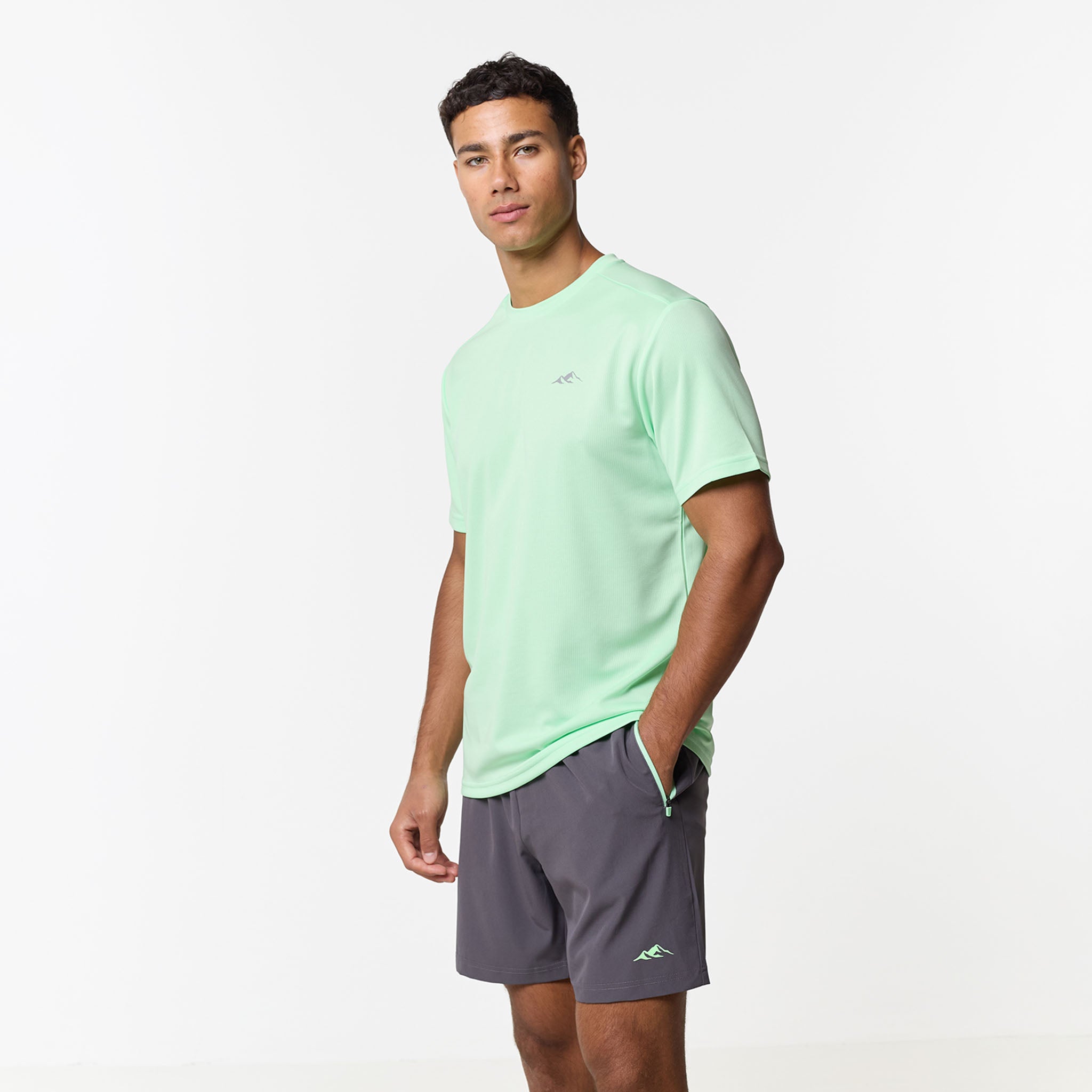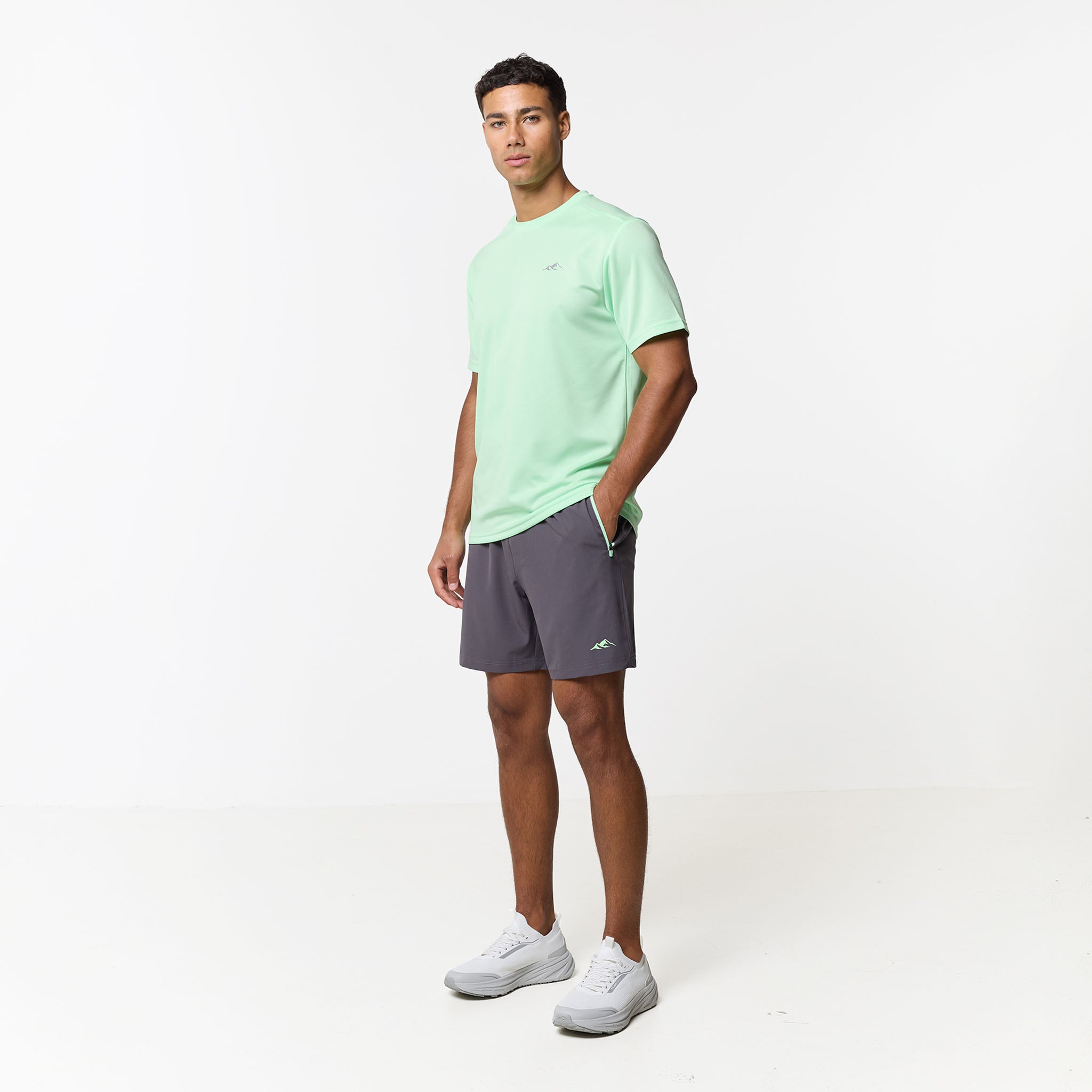 Elevate your training sessions with the Pace Performance Twinset in a vibrant Vapour Green/Charcoal, a coordinated duo engineered for high-intensity movement and refined everyday wear. The regular-fit crew neck tee is crafted from a premium, lightweight poly fabric that excels in climate control; its breathable, moisture-wicking, and quick-drying properties ensure you remain cool and dry. Branded with the signature CLSR Tech logo on the chest, the tee pairs perfectly with high-utility shorts designed for a precision fit. These shorts feature an elasticated waistband with internal drawcords finished with durable rubber-dipped ends, reinforced by internal button-hole detailing for a streamlined look. The contrast pockets are equipped with reverse nylon coil zippers and auto-lock pullers to keep your essentials secure, while twin-needle hem stitching provides a clean, rugged finish that stands up to constant wear.