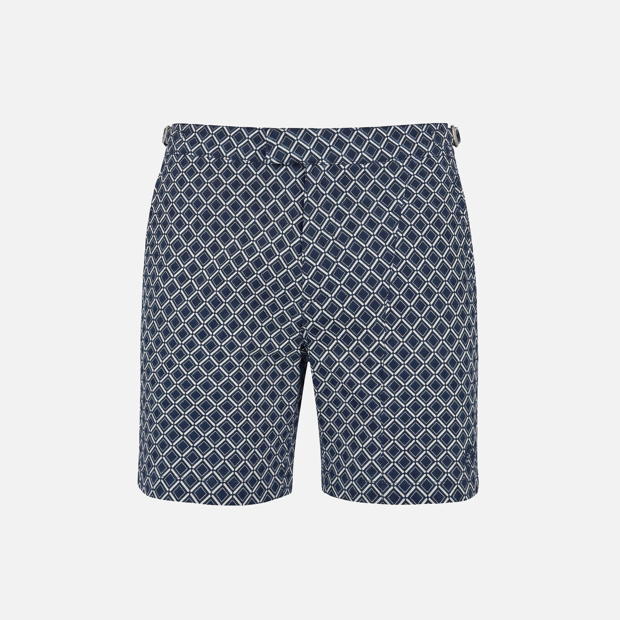 Upgrade your poolside aesthetic with the new season Printed Smart Buckle Swimshorts in Navy, a premium take on a summer essential. Crafted for a tailored look, these shorts feature a self-fabric waistband equipped with branded metal side adjusters and an elasticated back for the perfect blend of structure and comfort. The refined design is detailed with a concealed press stud closure, zip fly stitching, and the signature Closure London embroidered logo. Complete with elegant welt side pockets and a matching rear pocket, they offer a sharp, streamlined silhouette that carries you effortlessly from the pool to the beach club.