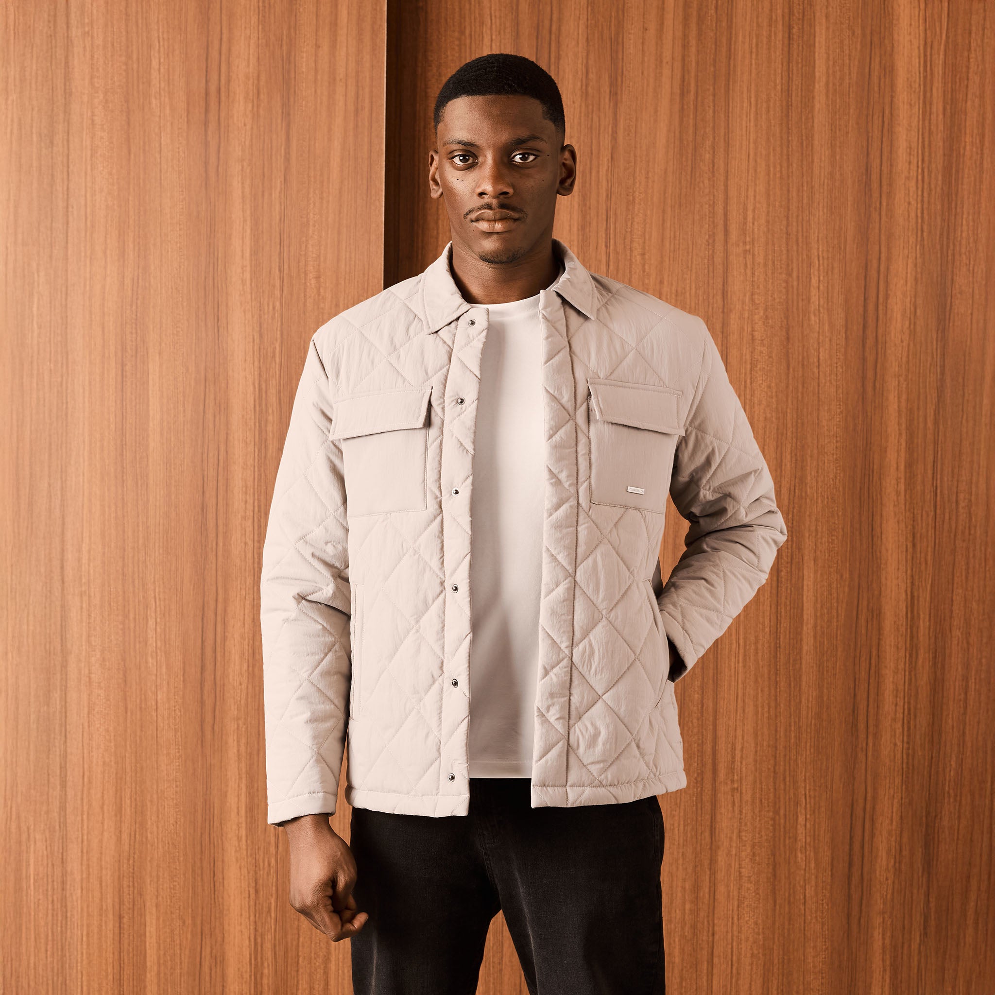 Elevate your look with the Quilted Overshirt Jacket in a versatile stone hue. This piece perfectly blends classic design with modern utility, featuring an elegant diamond-quilted exterior and a comfortable quilted lining for warmth without added bulk. Practicality is key, evident in the padded collar with a refined collar stand and reinforced back neck tape. Convenient and secure storage is offered with two chest pockets, each with a patch design and concealed press studs. A subtle yet premium Closure branded metal badge marks its quality. The sleek front placket features concealed press stud fastening, ensuring a clean, streamlined aesthetic. Completing the design is a neat self-turn hem, making this jacket your ideal choice for reliable style.