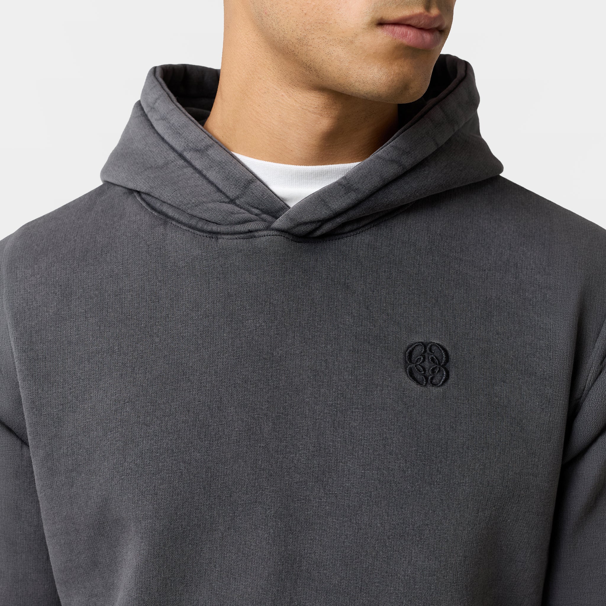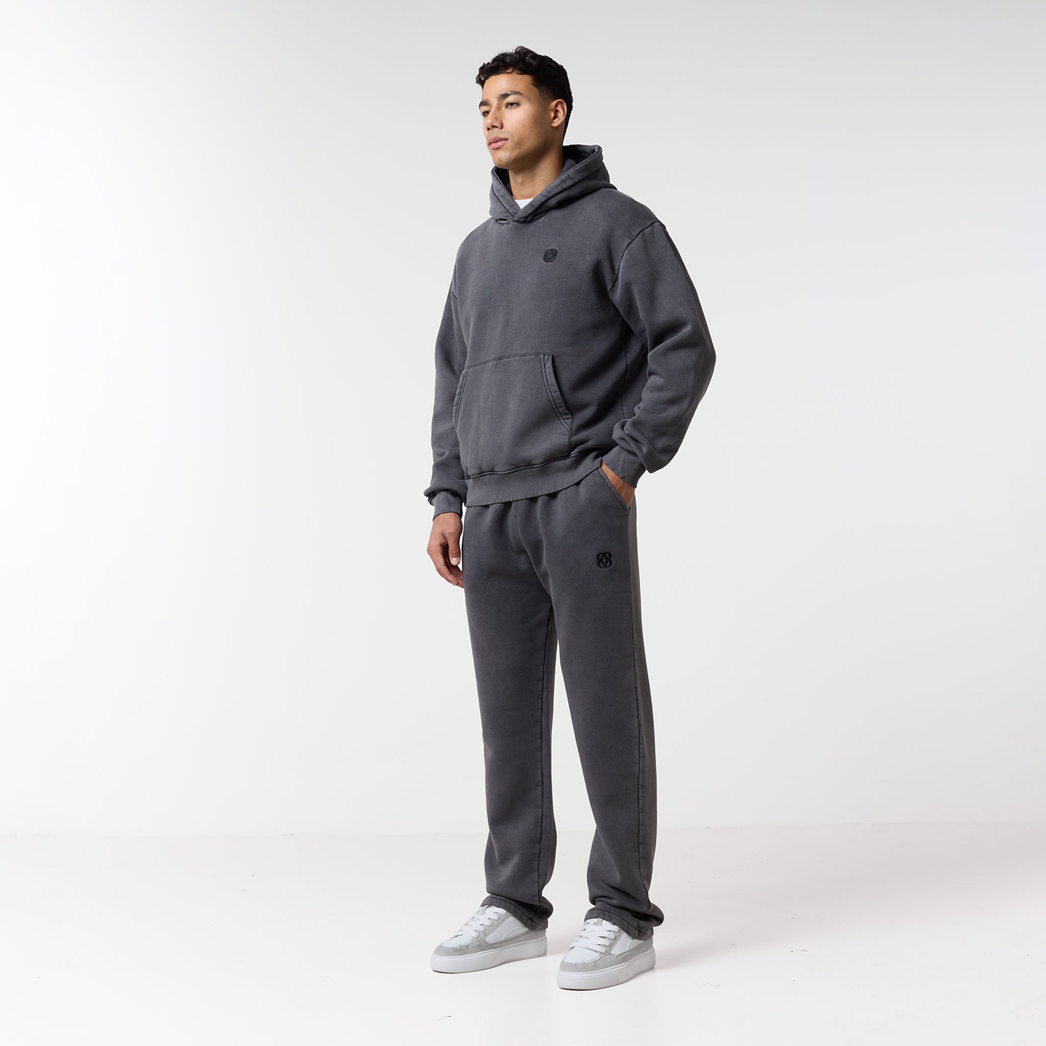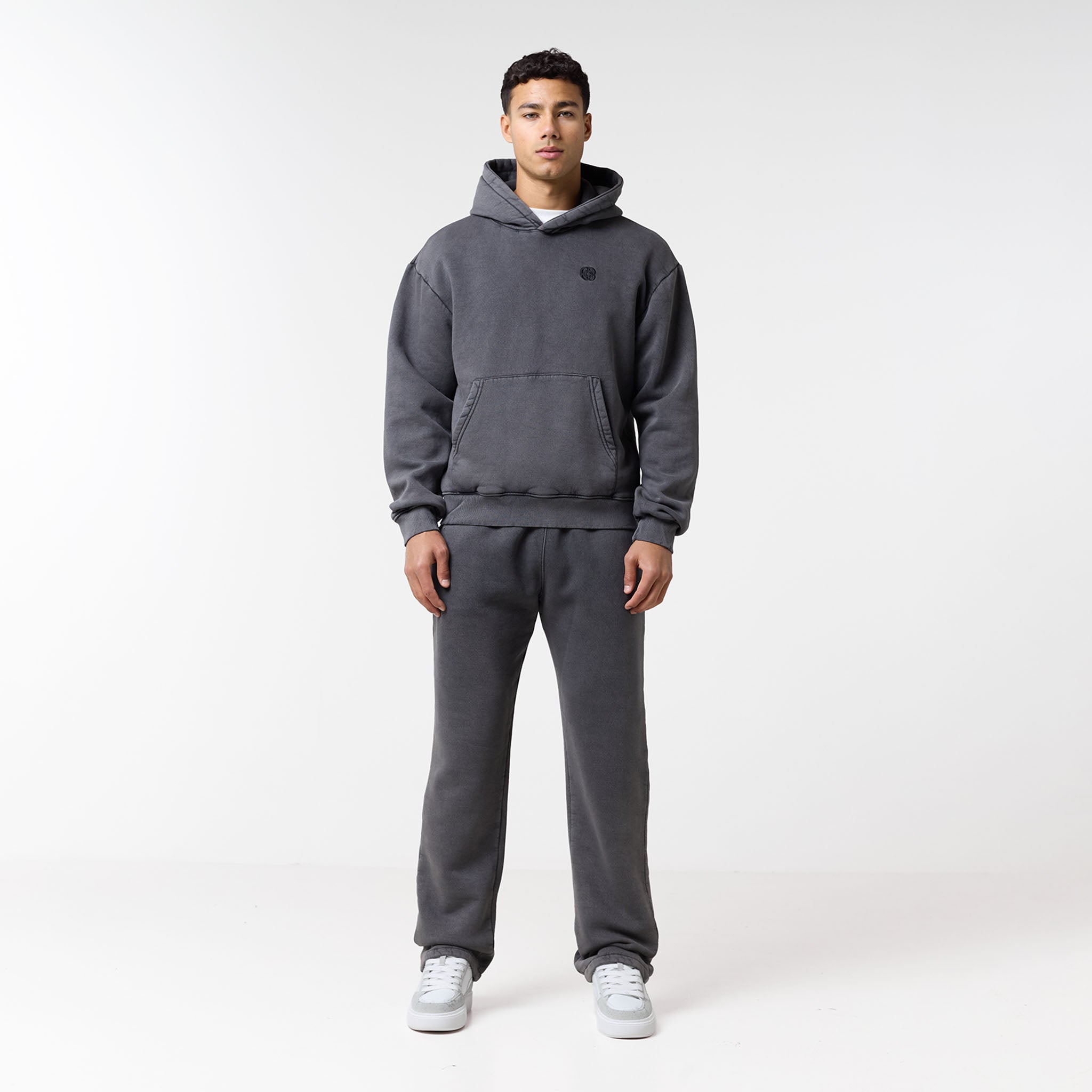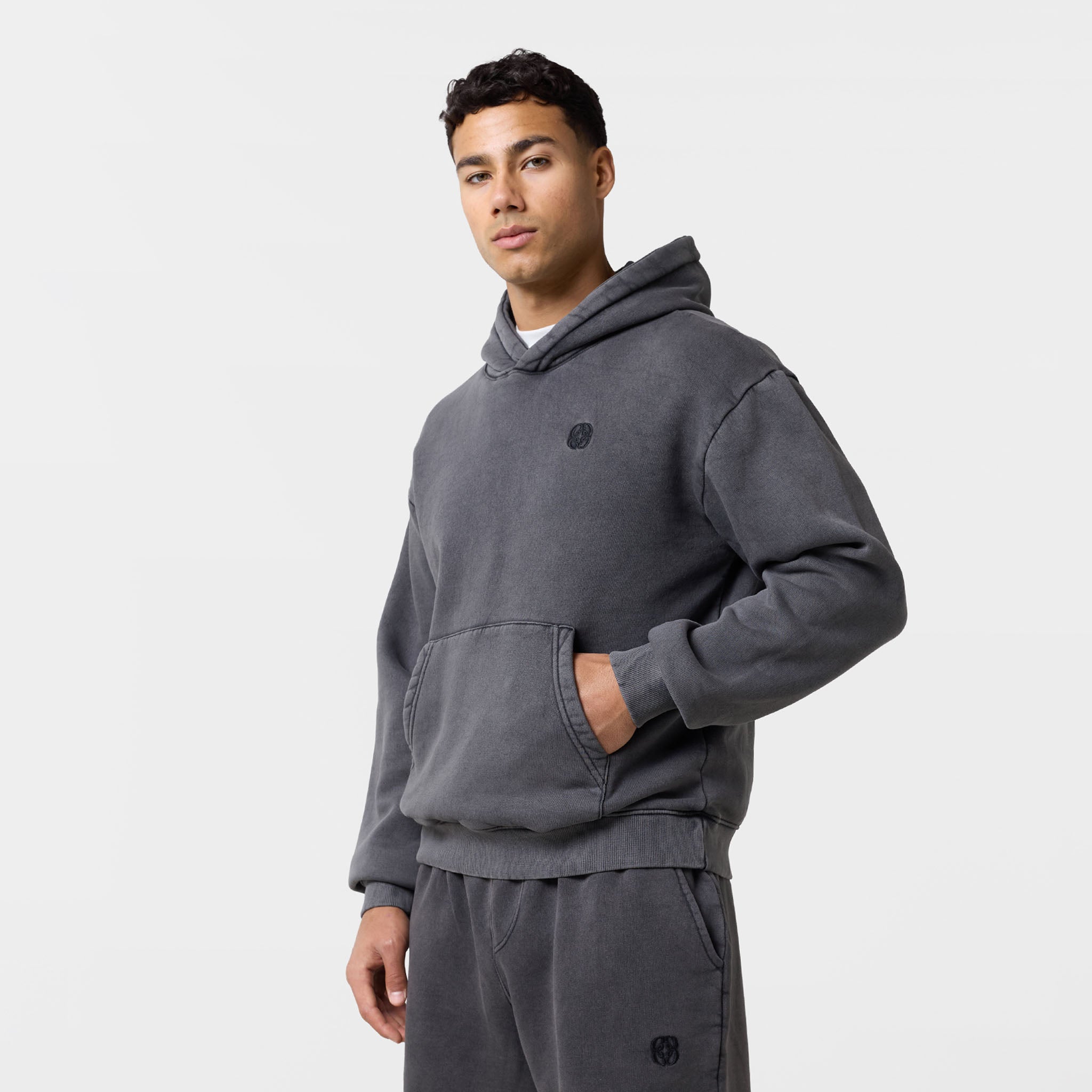 Introducing the ultimate comfort pairing: the Relaxed Icon Hoodie and Open Hem Joggers in a modern Washed Black. Both pieces are crafted from a premium 300GSM brushed fleece cotton, offering superior warmth and a luxurious feel. The Relaxed Icon Hoodie elevates your casual look with a contemporary crossover hood, a spacious kangaroo pocket, and a subtly embroidered chest emblem. The matching Relaxed Fit Icon Open Hem Joggers ensure a secure, personalized fit with a heavy ribbed elasticated waistband and drawcords. Practical slanted side pockets and a signature icon logo complete the design. Designed for ultimate comfort, this coordinated Washed Black set is perfect for relaxing in style.