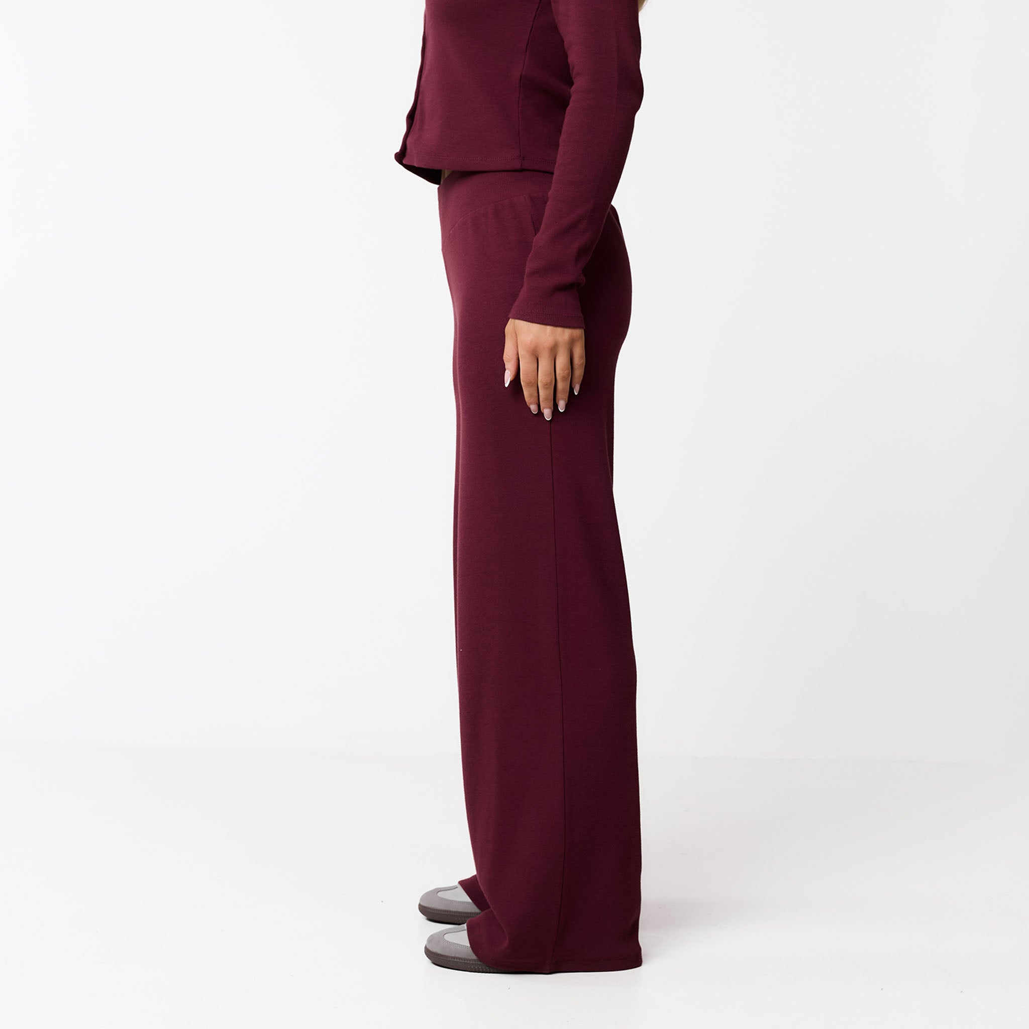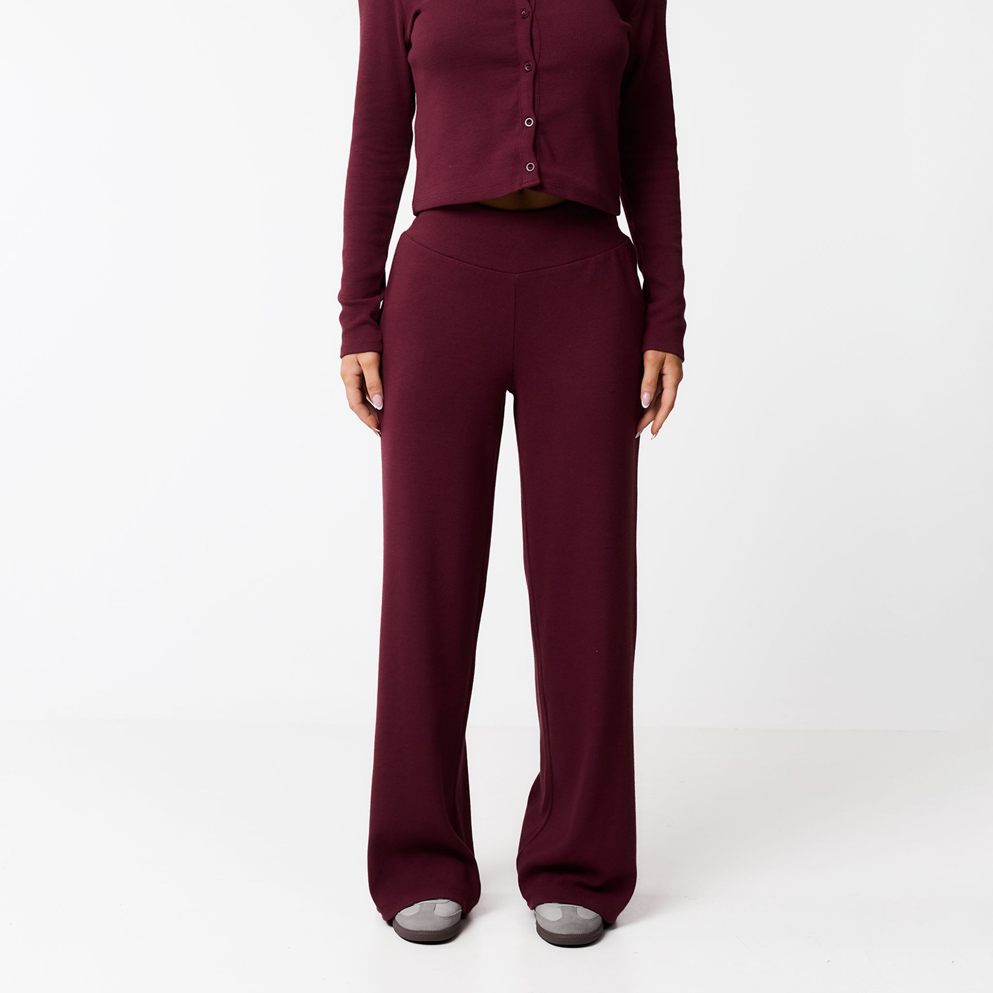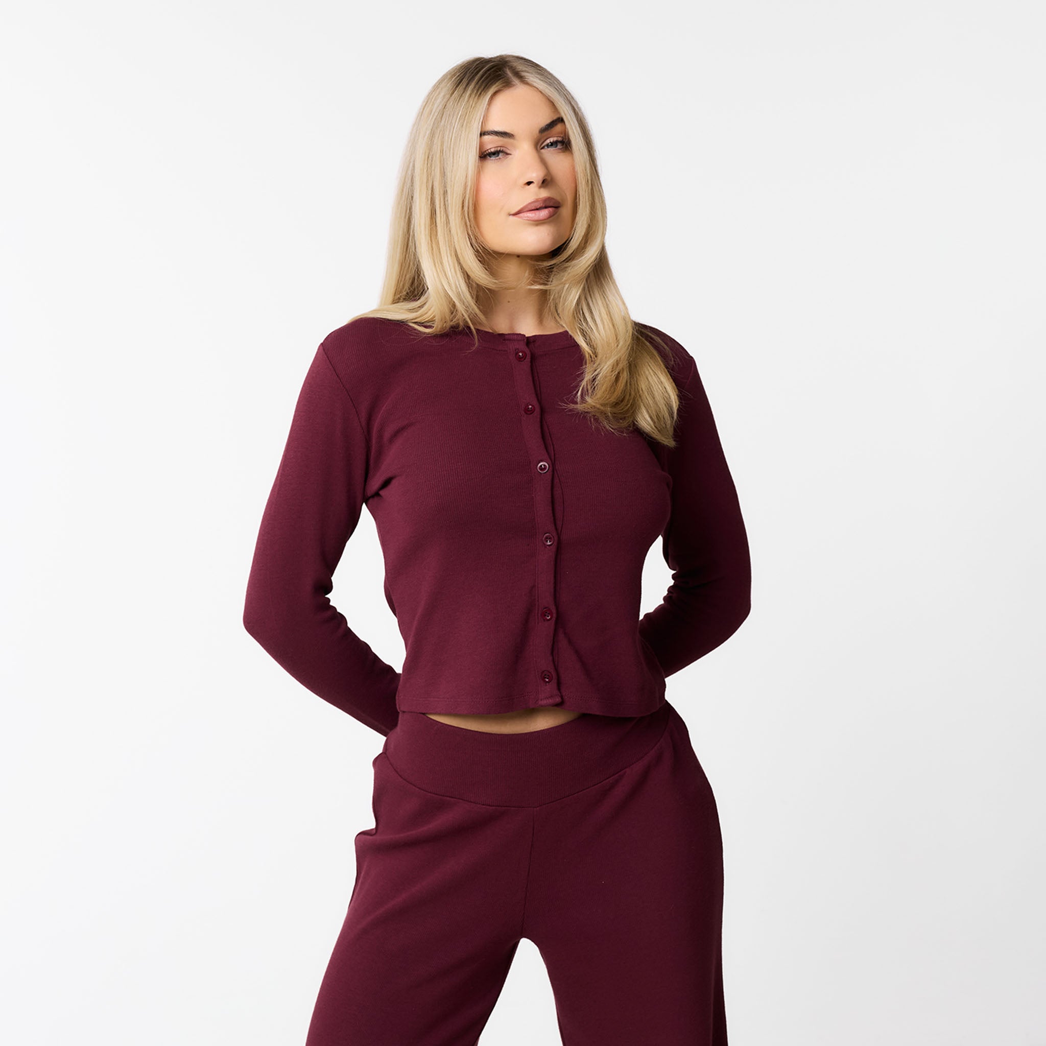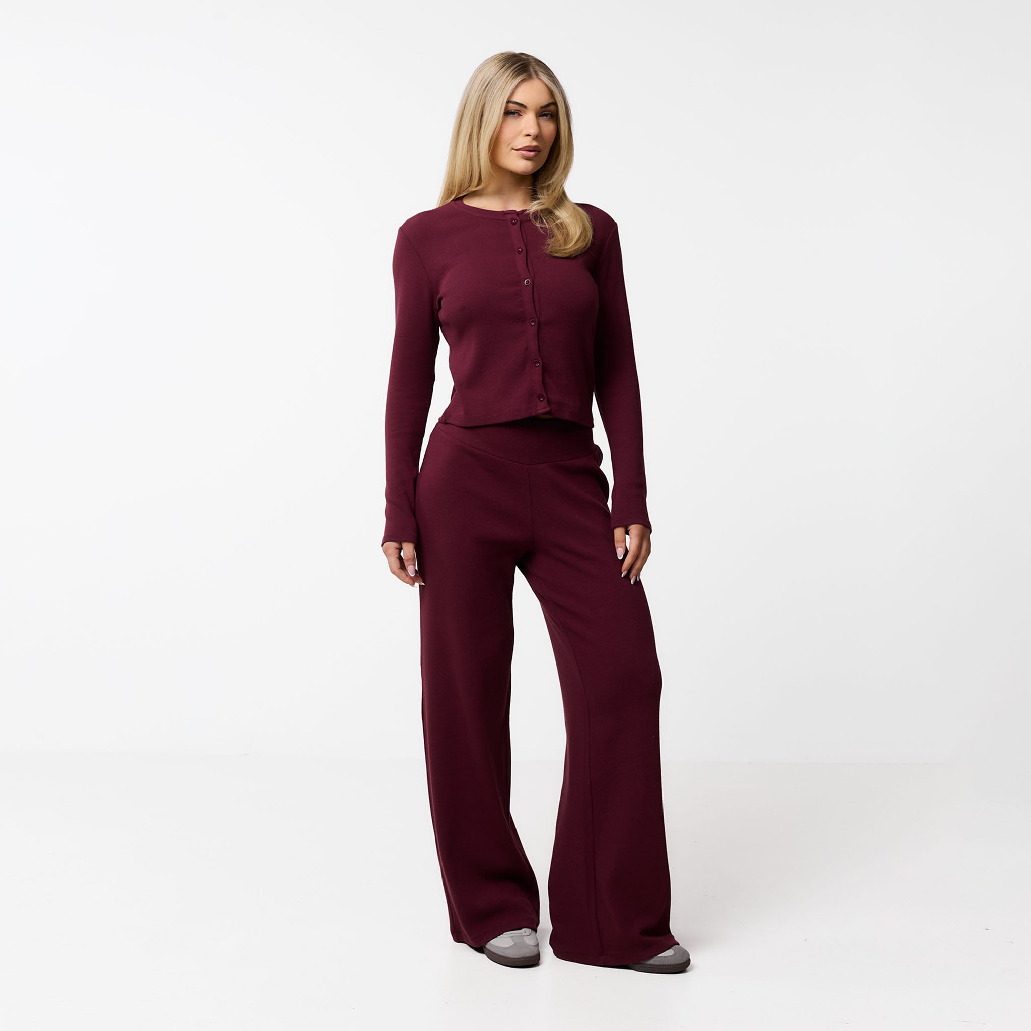 Meet your new go-to for effortless style: the Ribbed Twinset in burgundy. This coordinated set includes the Ribbed Button-Up Top and matching Ribbed Open Hem Pants. The top features a soft, stretchy ribbed fabric with long sleeves, a crew neck, and a button-down front, all finished with a durable twin needle stitch. The pants have a comfy waistband and a flattering open hem, complete with a twin needle hem stitch for a polished look. Perfect for a cosy chilled day or styled up for your social calendar, this twinset offers both comfort and chic design.