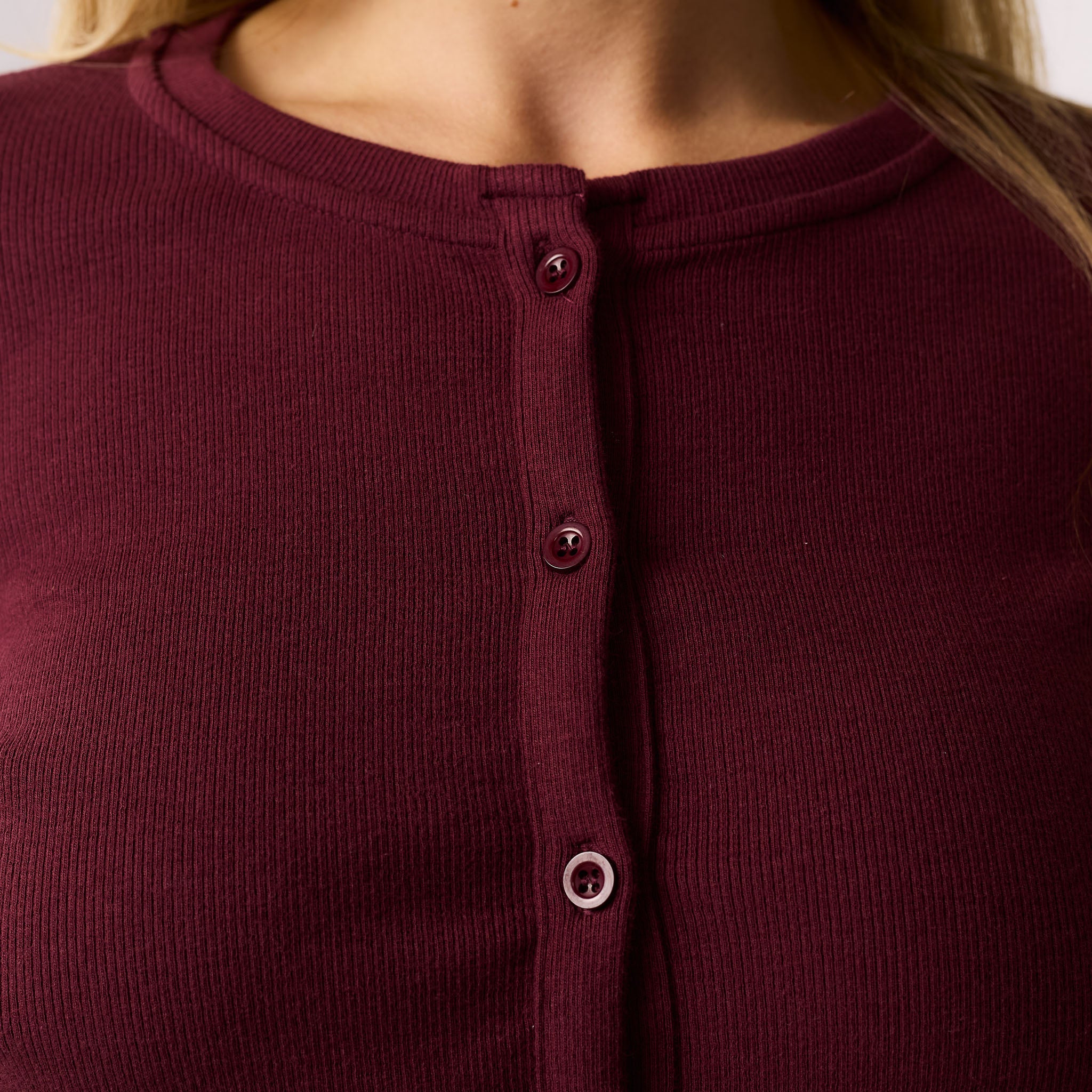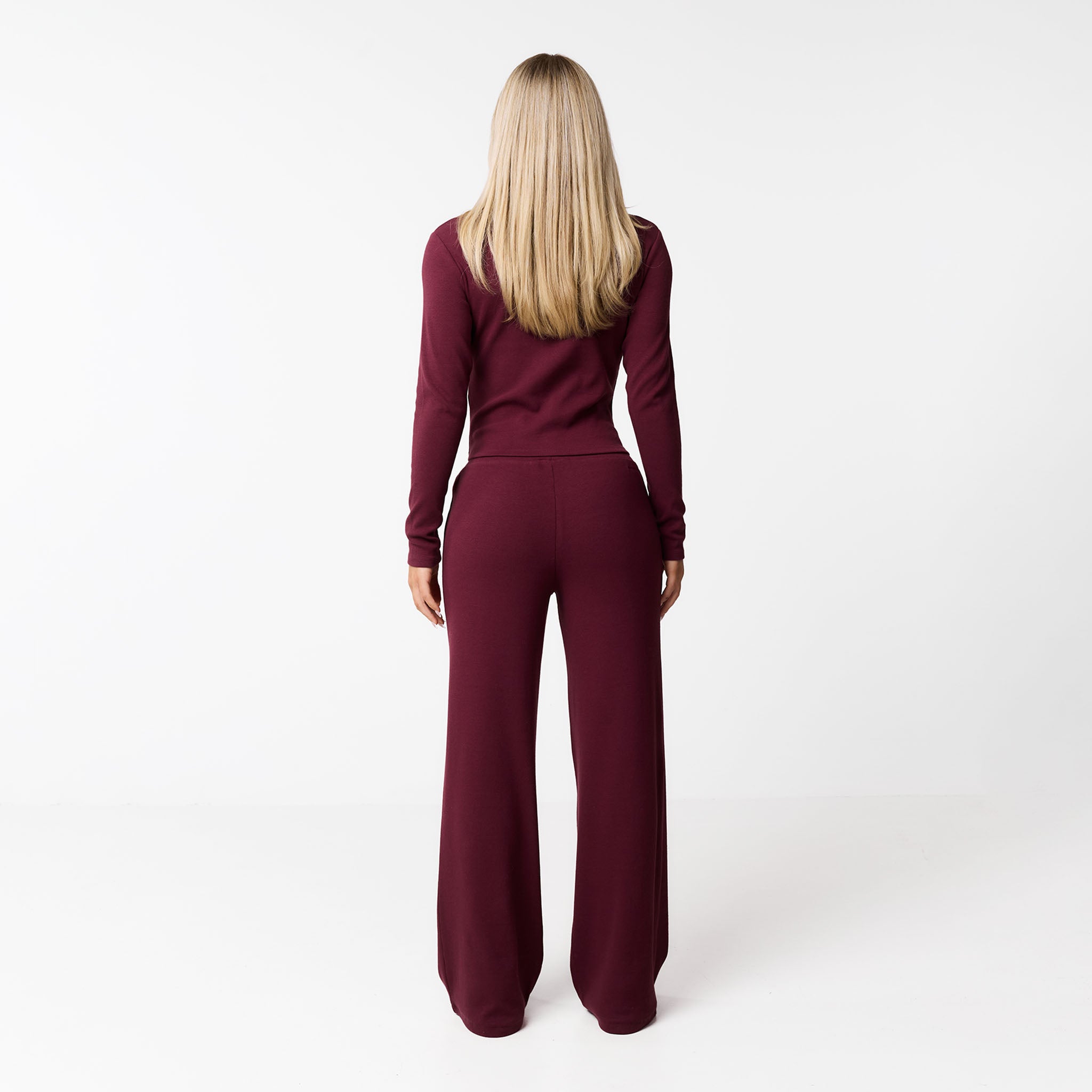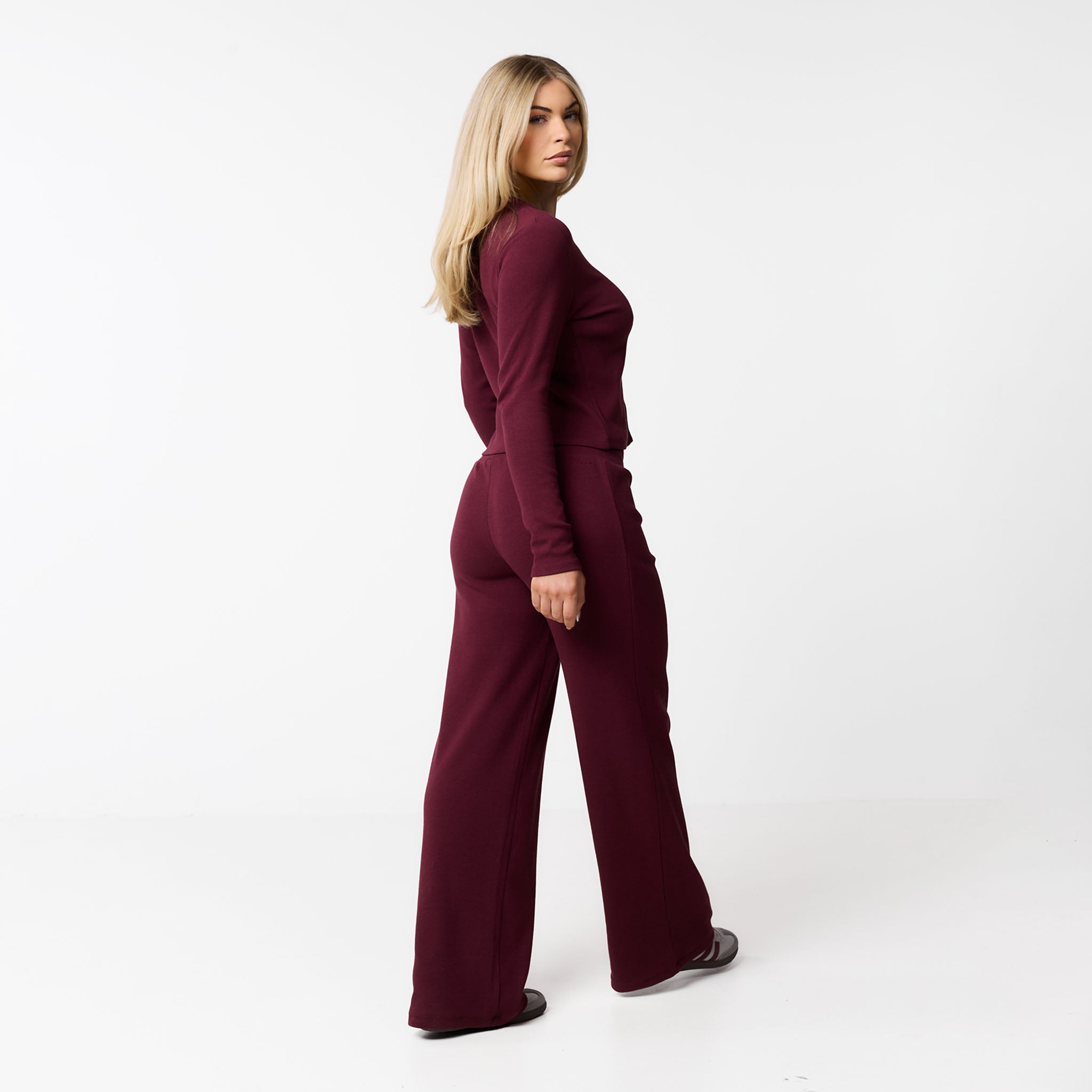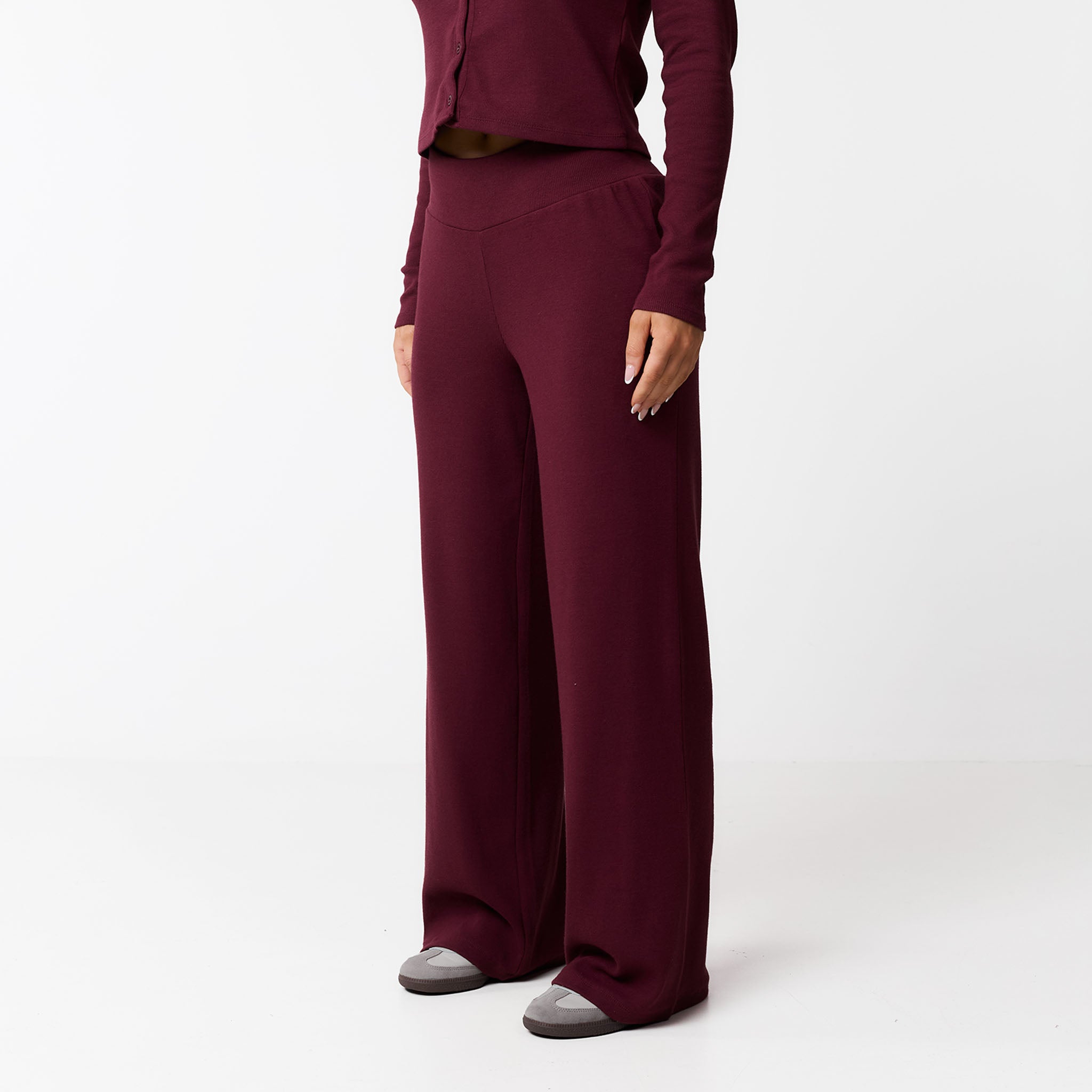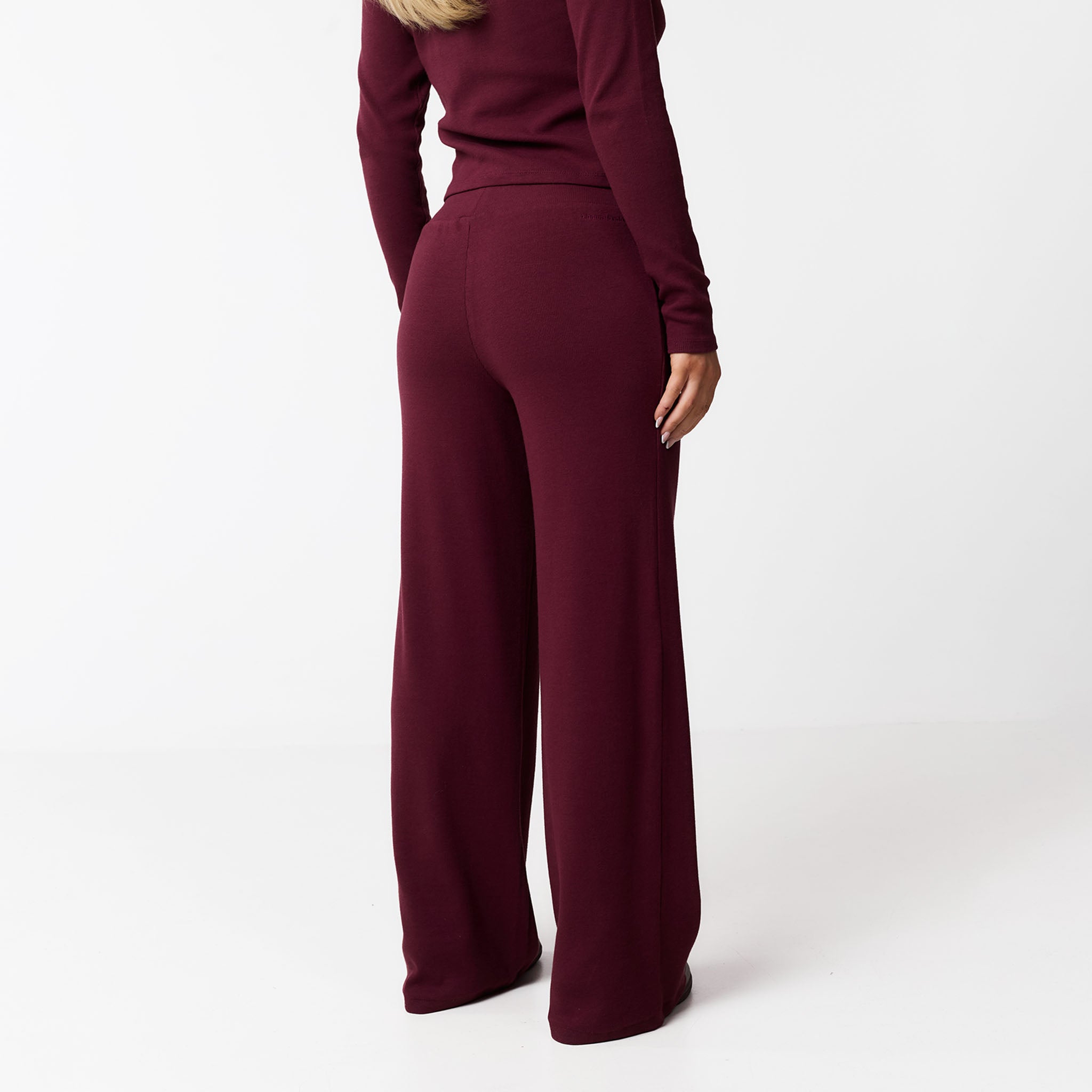 Meet your new go-to for effortless style: the Ribbed Twinset in burgundy. This coordinated set includes the Ribbed Button-Up Top and matching Ribbed Open Hem Pants. The top features a soft, stretchy ribbed fabric with long sleeves, a crew neck, and a button-down front, all finished with a durable twin needle stitch. The pants have a comfy waistband and a flattering open hem, complete with a twin needle hem stitch for a polished look. Perfect for a cosy chilled day or styled up for your social calendar, this twinset offers both comfort and chic design.