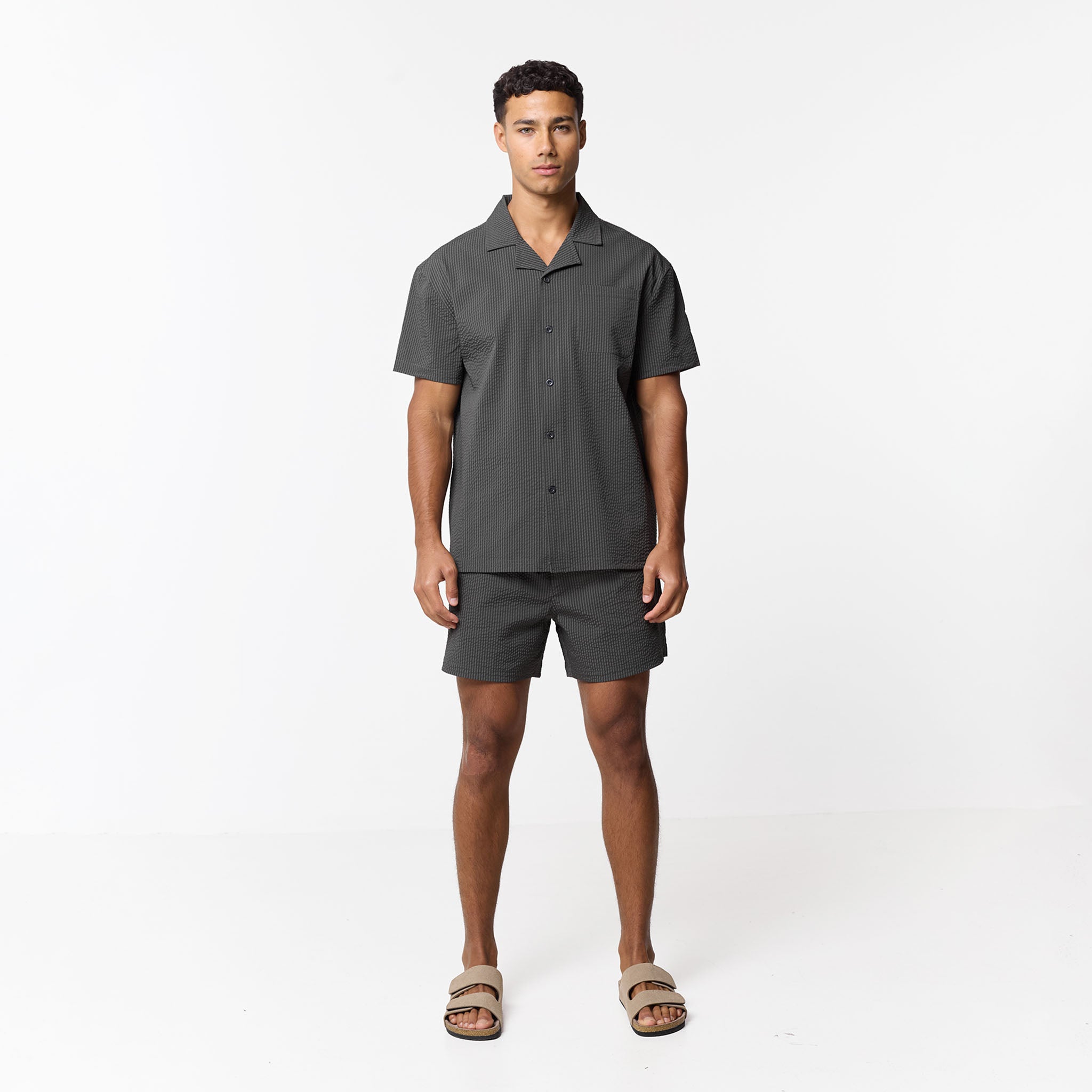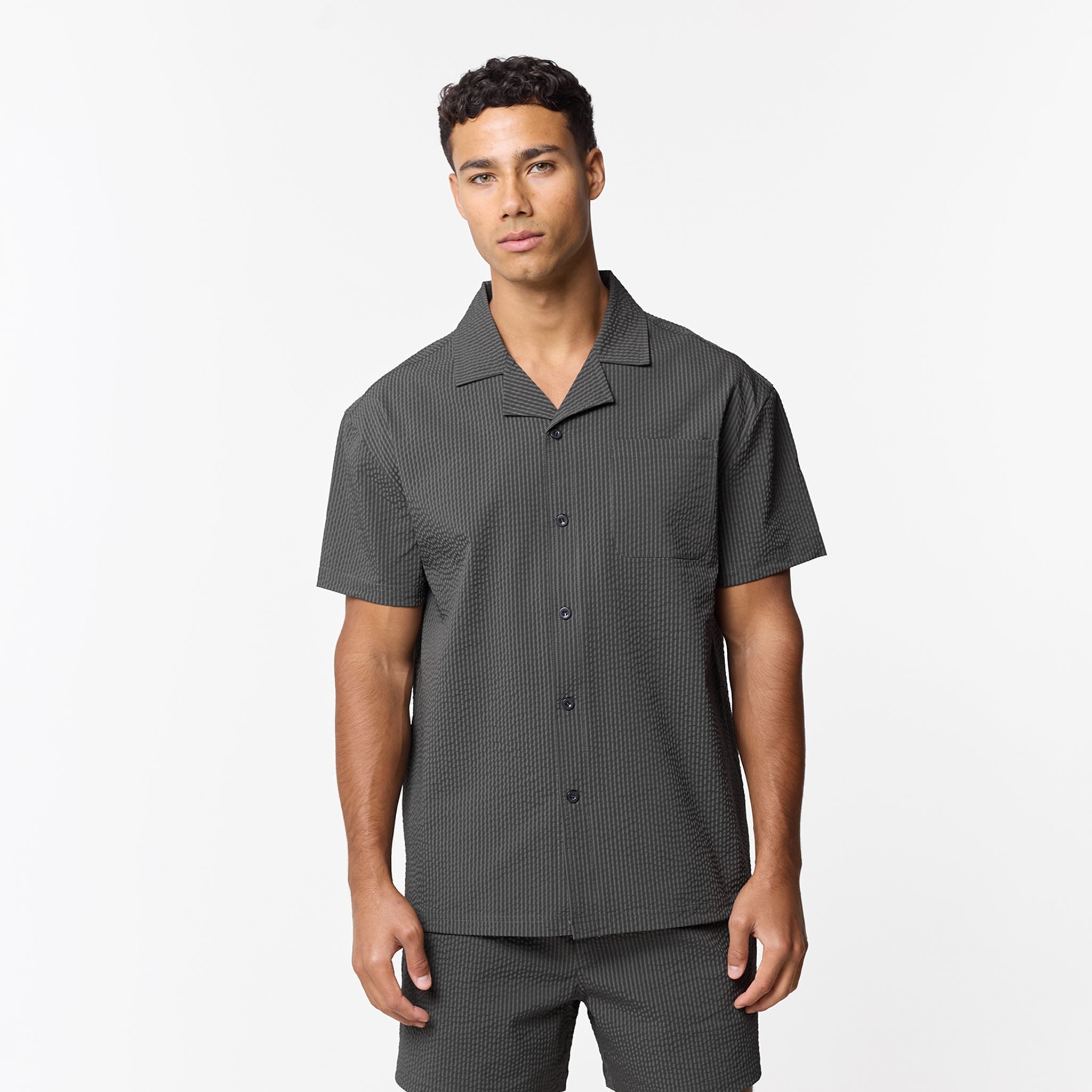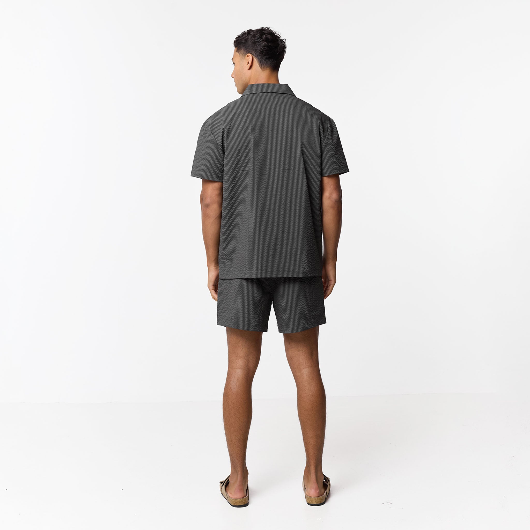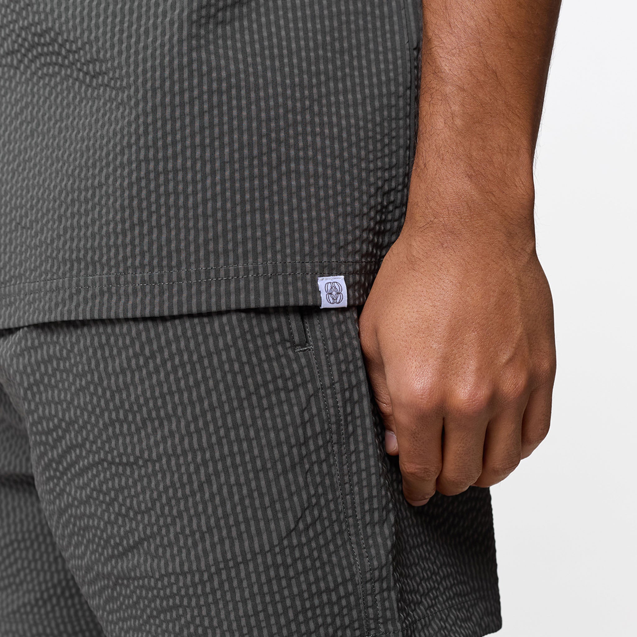 Introducing the Seersucker Swimshort Twinset, the ultimate resort essential, pairing a refined shirt with matching swim shorts for a cohesive, sharp aesthetic. Crafted from iconic puckered fabric for maximum airflow, the set features a structured revere collar and forward-pitched shoulders for a polished silhouette that transitions effortlessly from the pool to the lounge. While the shirt boasts a minimalist grown-on placket and tonal buttons, the shorts prioritise functionality with a streamlined waistband, internal mesh lining, and durable rubber-dipped drawcords. Finished with signature woven labels and clean-turned hems, this coordinated set ensures you maintain a sharp look.