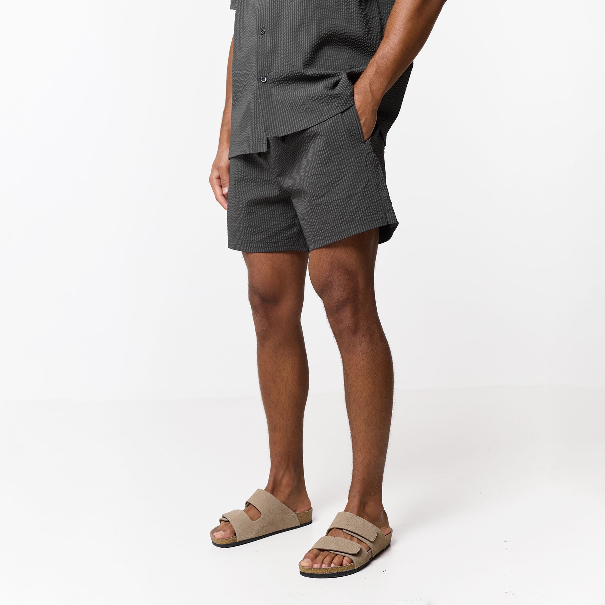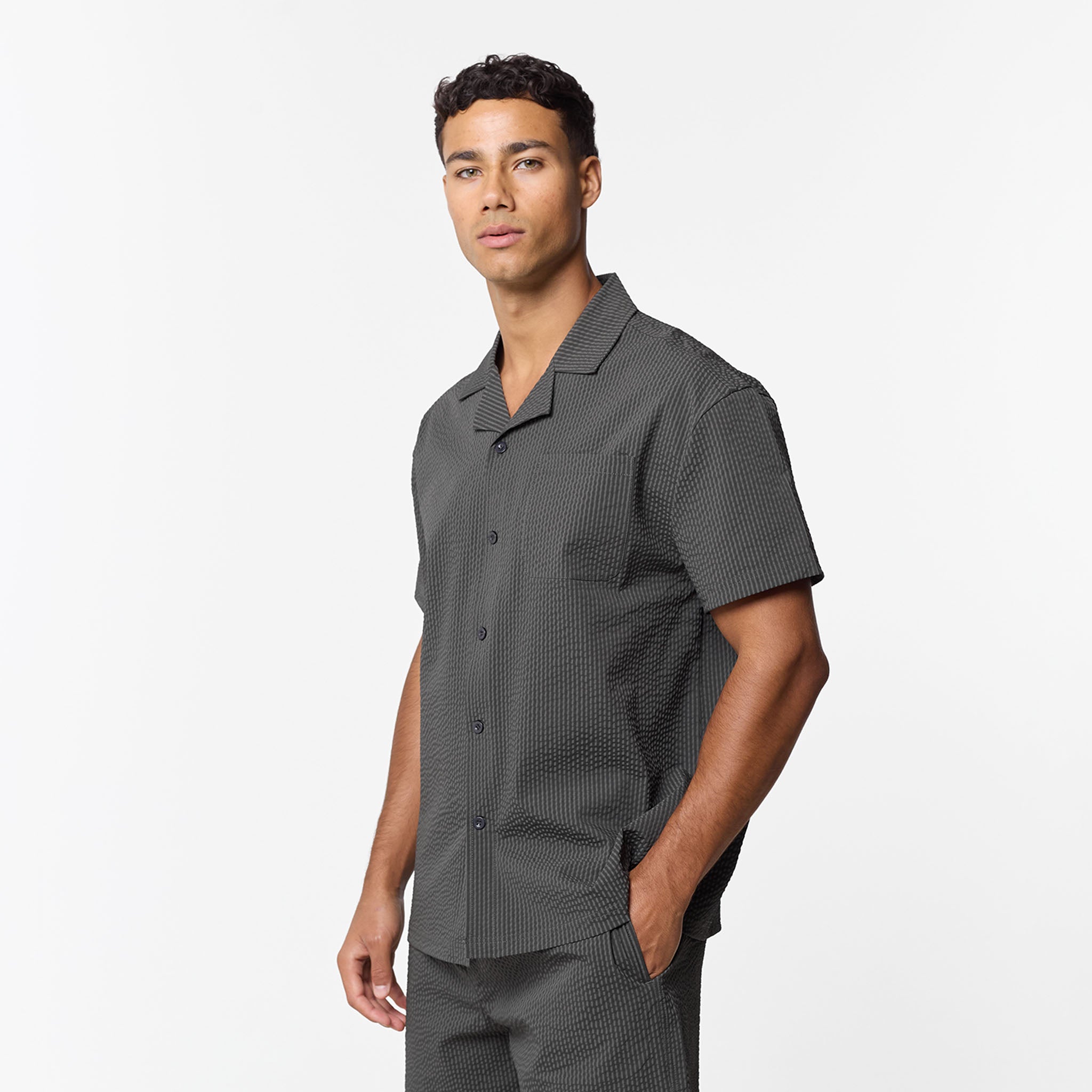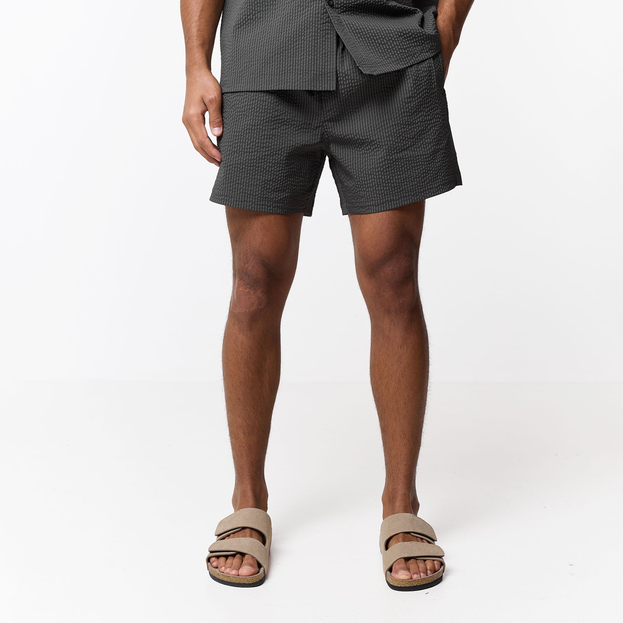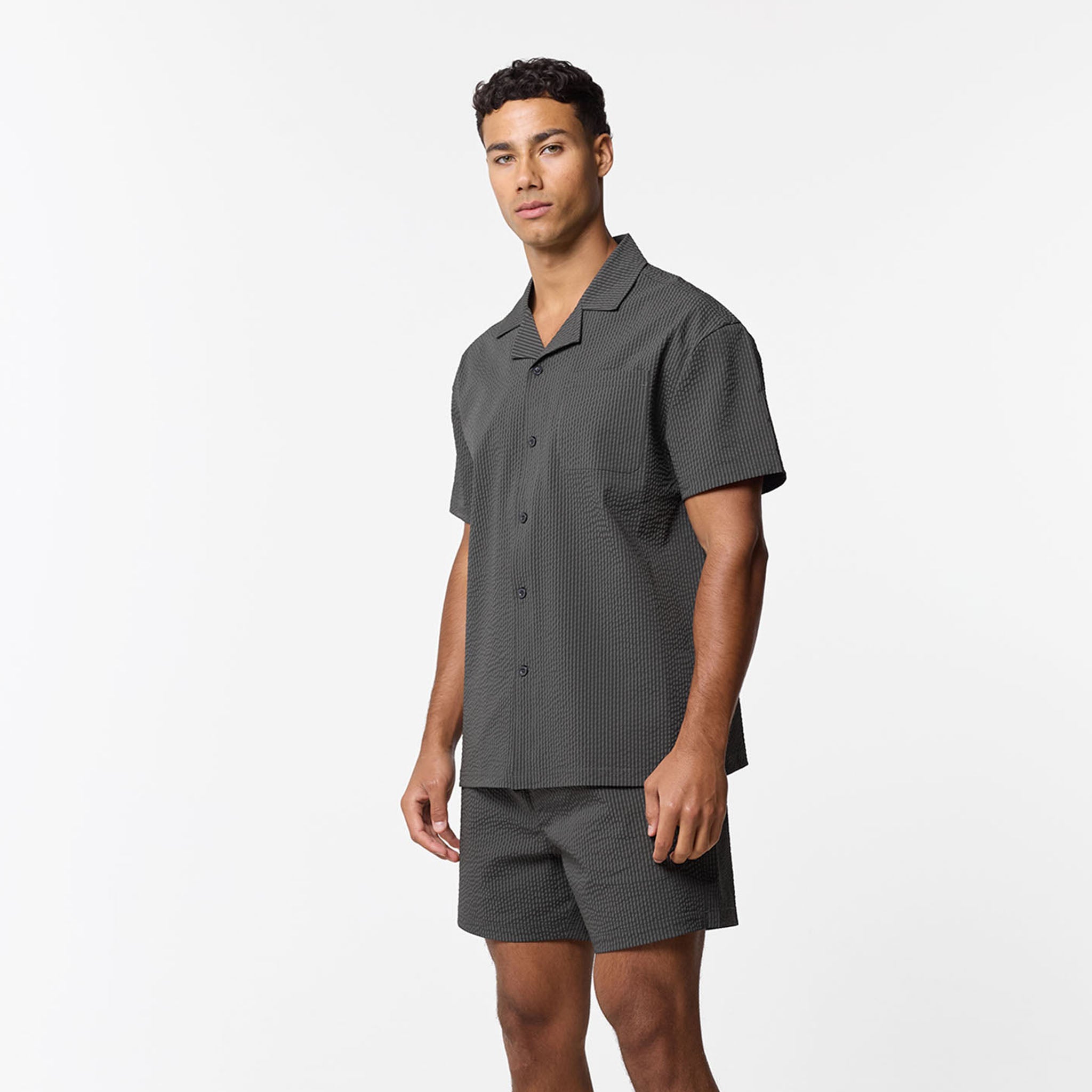Introducing the Seersucker Swimshort Twinset, the ultimate resort essential, pairing a refined shirt with matching swim shorts for a cohesive, sharp aesthetic. Crafted from iconic puckered fabric for maximum airflow, the set features a structured revere collar and forward-pitched shoulders for a polished silhouette that transitions effortlessly from the pool to the lounge. While the shirt boasts a minimalist grown-on placket and tonal buttons, the shorts prioritise functionality with a streamlined waistband, internal mesh lining, and durable rubber-dipped drawcords. Finished with signature woven labels and clean-turned hems, this coordinated set ensures you maintain a sharp look.