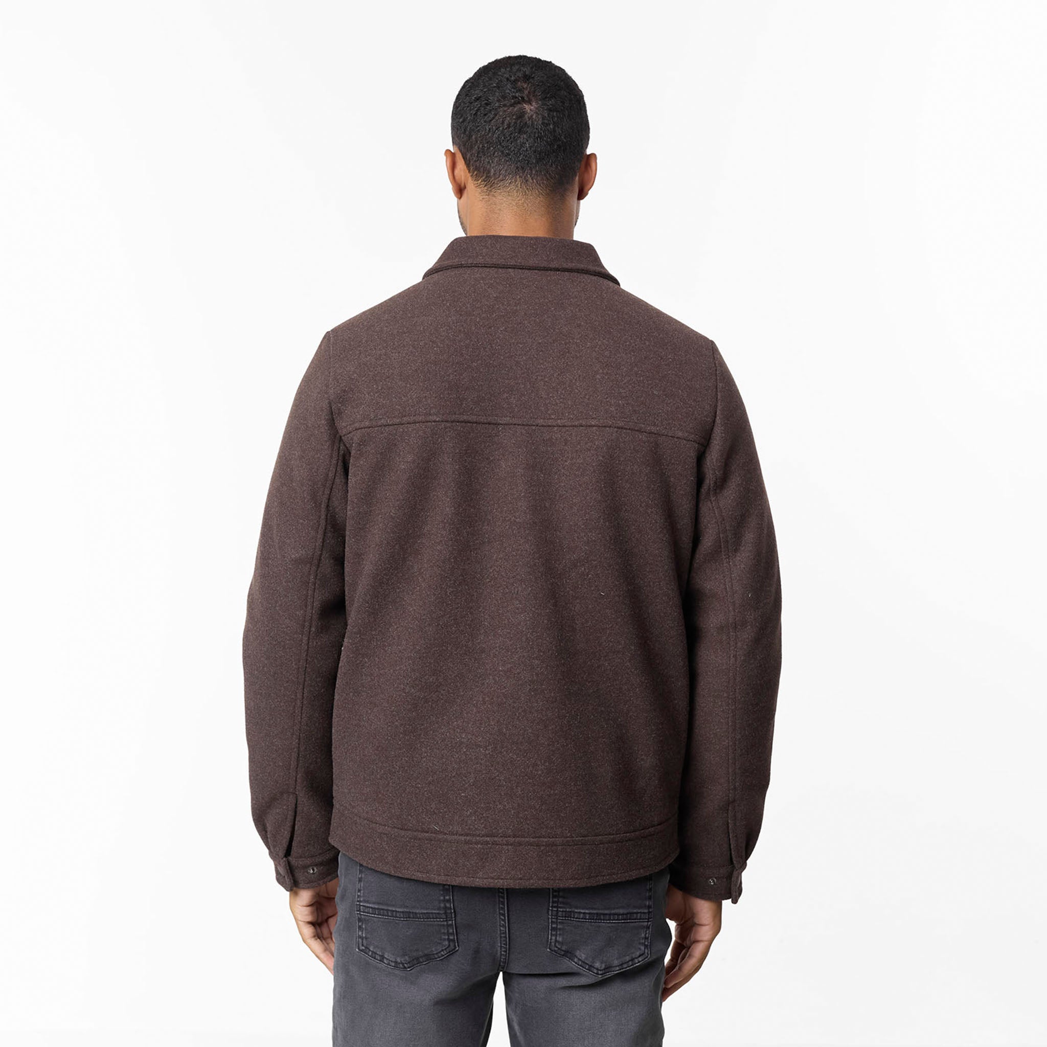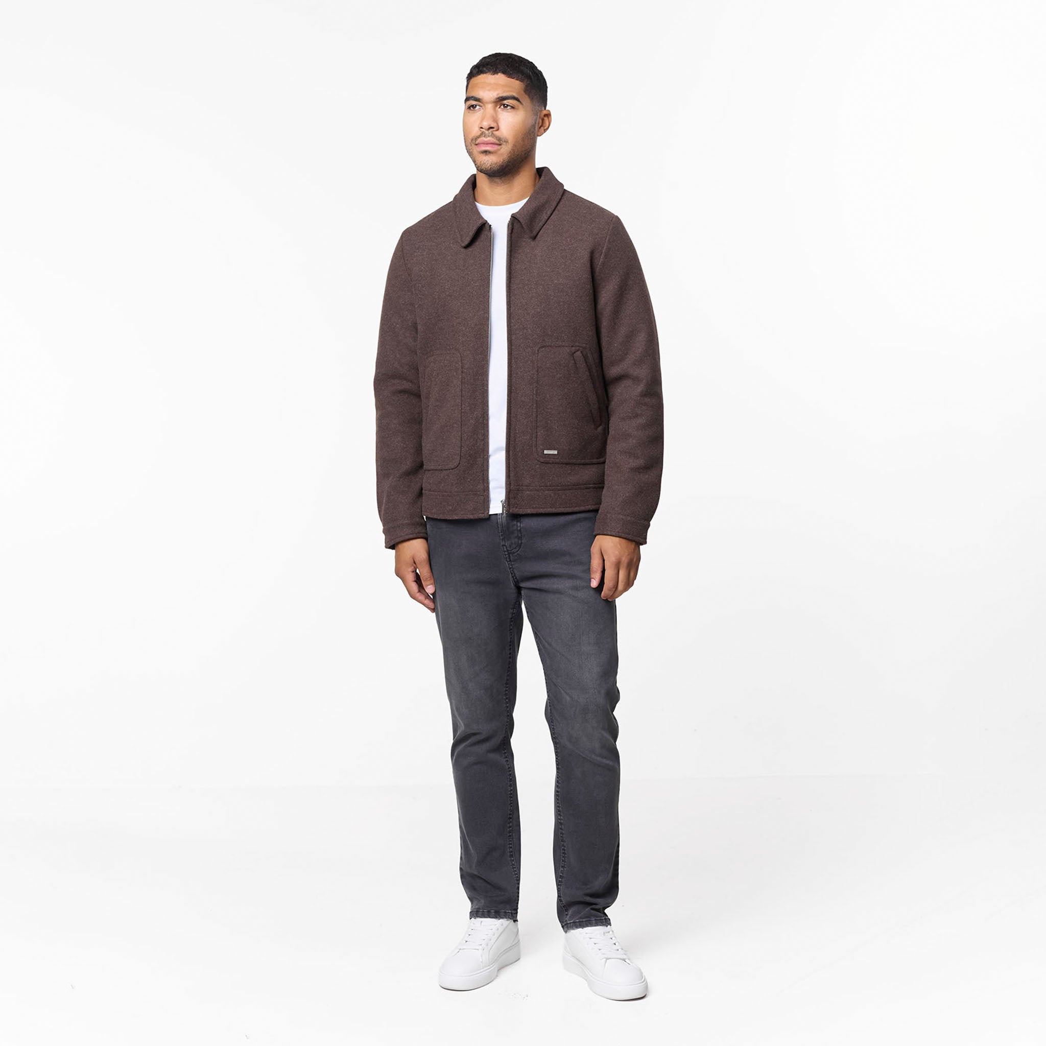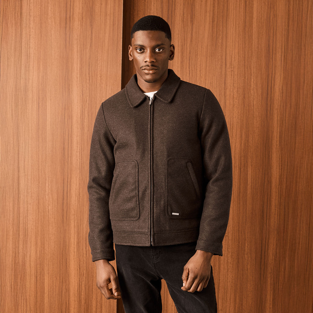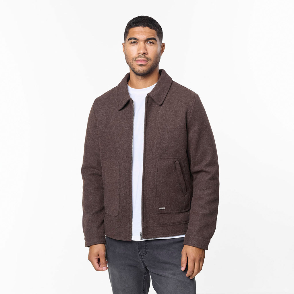 Discover effortless sophistication with our men's Smart Zip Through Wool Jacket in a rich brown hue. Made from luxurious faux wool, this jacket offers a polished look to complete your smart-casual ensembles.  It features a self-fabric collar and meticulous neck tape for a clean finish. The subtle jetted zip conceals a robust metal zip with our Closure branded zip pull, ensuring smooth and reliable wear. A stand-out patch pocket with intricate top stitch detail on the chest is further enhanced by a sleek metal Closure branded badge. The defined self-fabric cuff and hem create a neat silhouette, while the back yoke with twin needle stitch adds a subtle touch of tailored refinement. This jacket is your go-to for elevating any look.