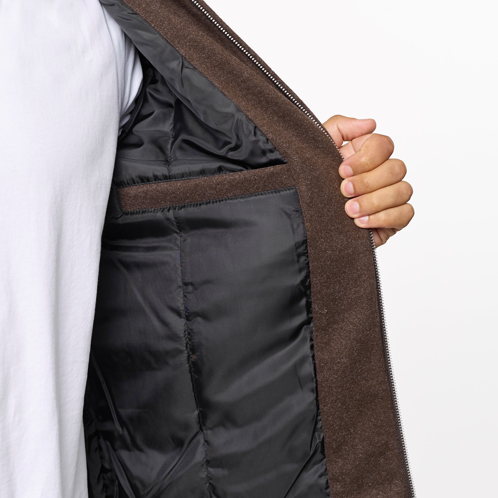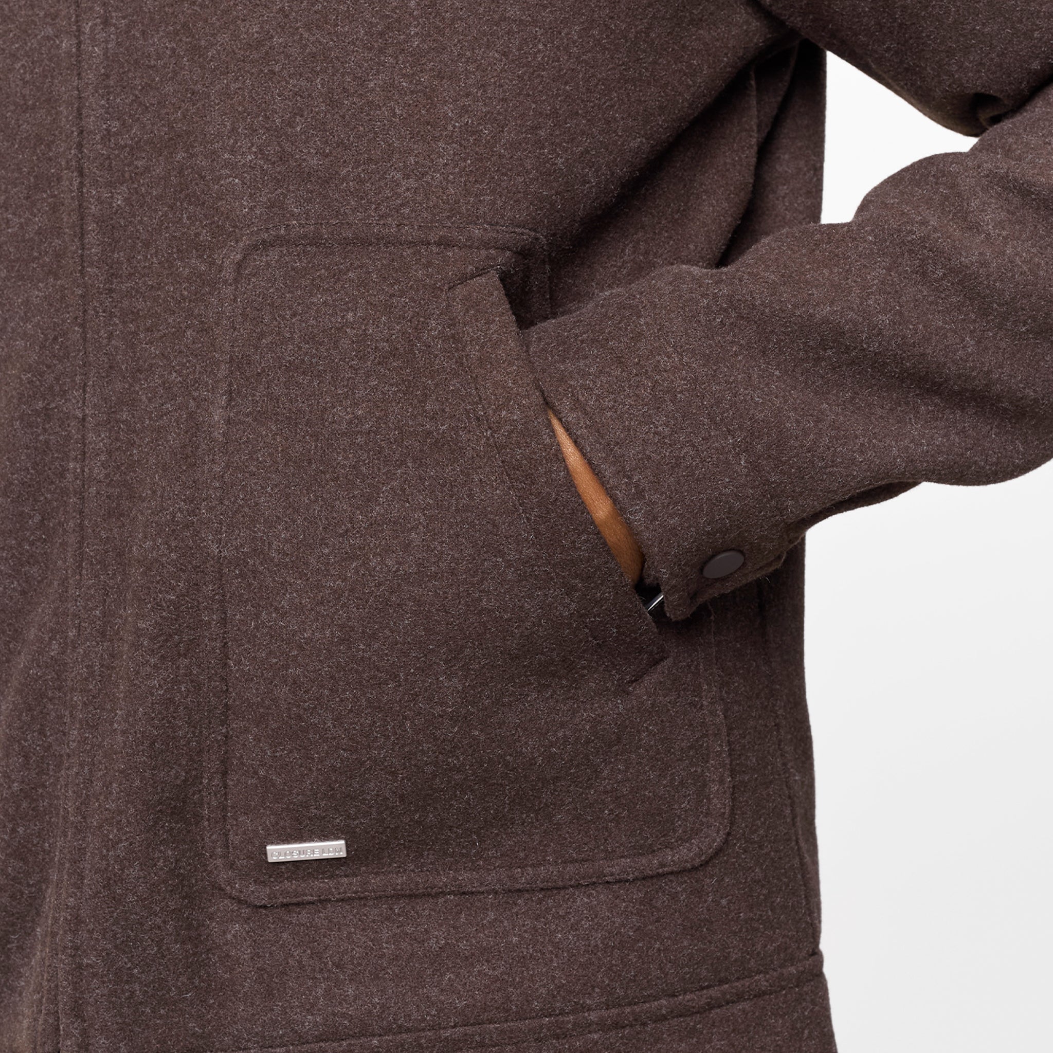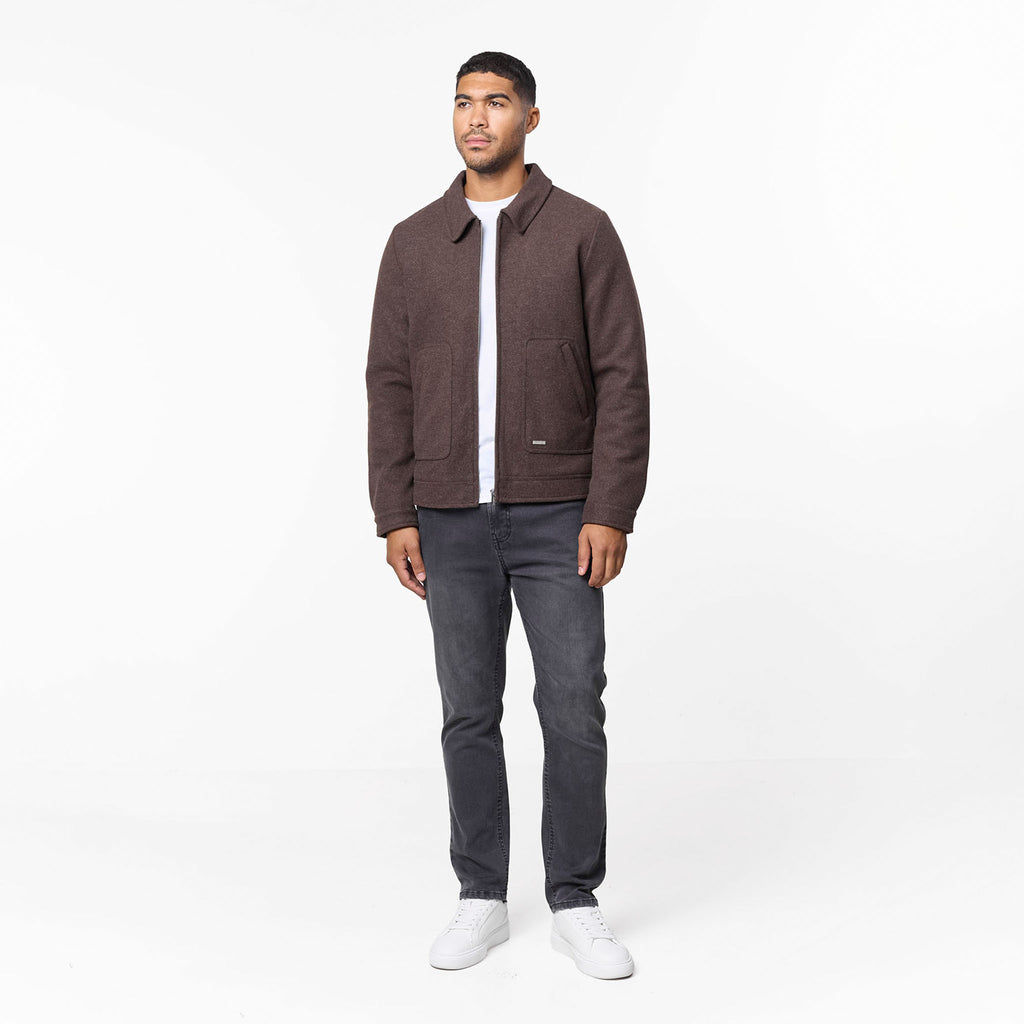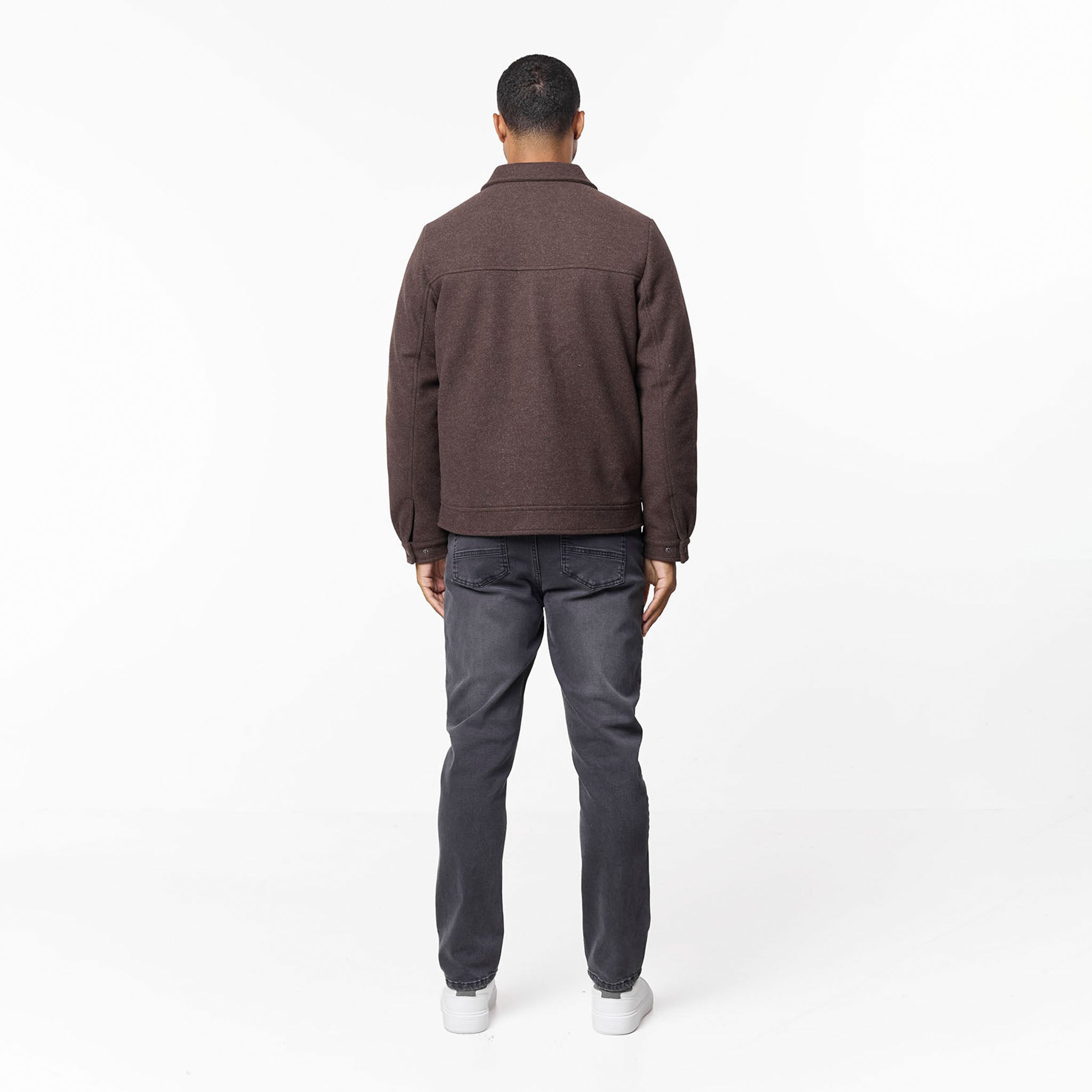 Discover effortless sophistication with our men's Smart Zip Through Wool Jacket in a rich brown hue. Made from luxurious faux wool, this jacket offers a polished look to complete your smart-casual ensembles.  It features a self-fabric collar and meticulous neck tape for a clean finish. The subtle jetted zip conceals a robust metal zip with our Closure branded zip pull, ensuring smooth and reliable wear. A stand-out patch pocket with intricate top stitch detail on the chest is further enhanced by a sleek metal Closure branded badge. The defined self-fabric cuff and hem create a neat silhouette, while the back yoke with twin needle stitch adds a subtle touch of tailored refinement. This jacket is your go-to for elevating any look.