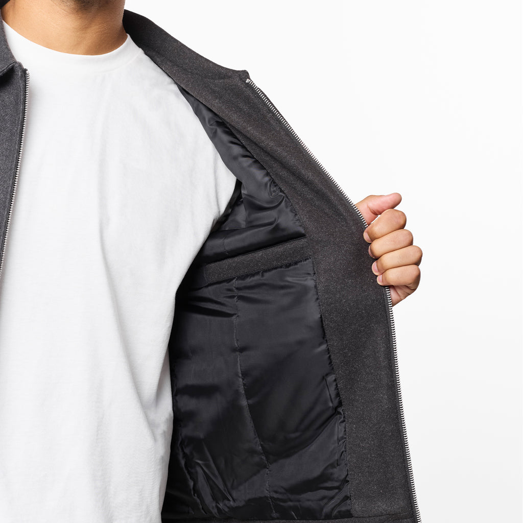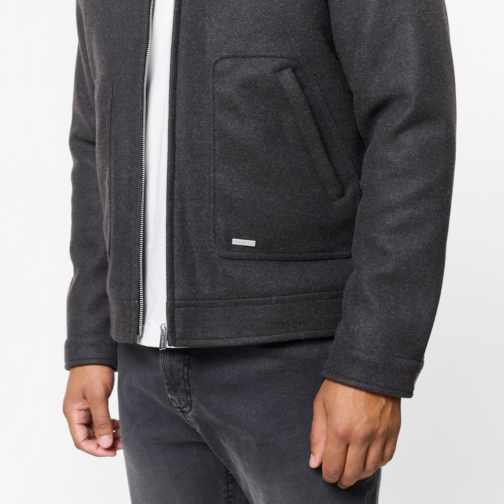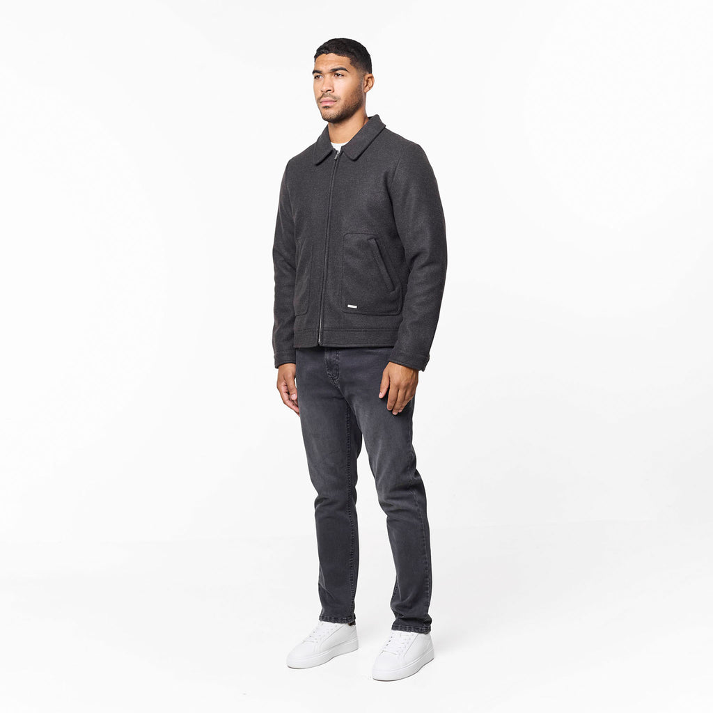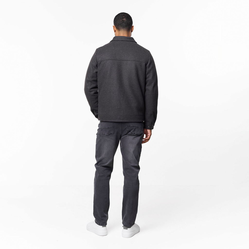 Add a contemporary edge to your wardrobe with the men's Smart Zip Through Wool Jacket in Charcoal. Crafted from high-quality faux wool, blends modern design with a comfortable, soft feel. Premium details include a sleek self-fabric collar and neat neck tape for a refined appearance. The functional jetted zip features a durable metal design with a Closure branded zip pull. A prominent patch pocket with thoughtful top stitch detail on the chest is accented by a sophisticated metal Closure branded badge. With its clean self-fabric cuff and hem and a distinctive back yoke featuring twin needle stitch, this jacket is a must-have for elevating your smart-casual ensembles.