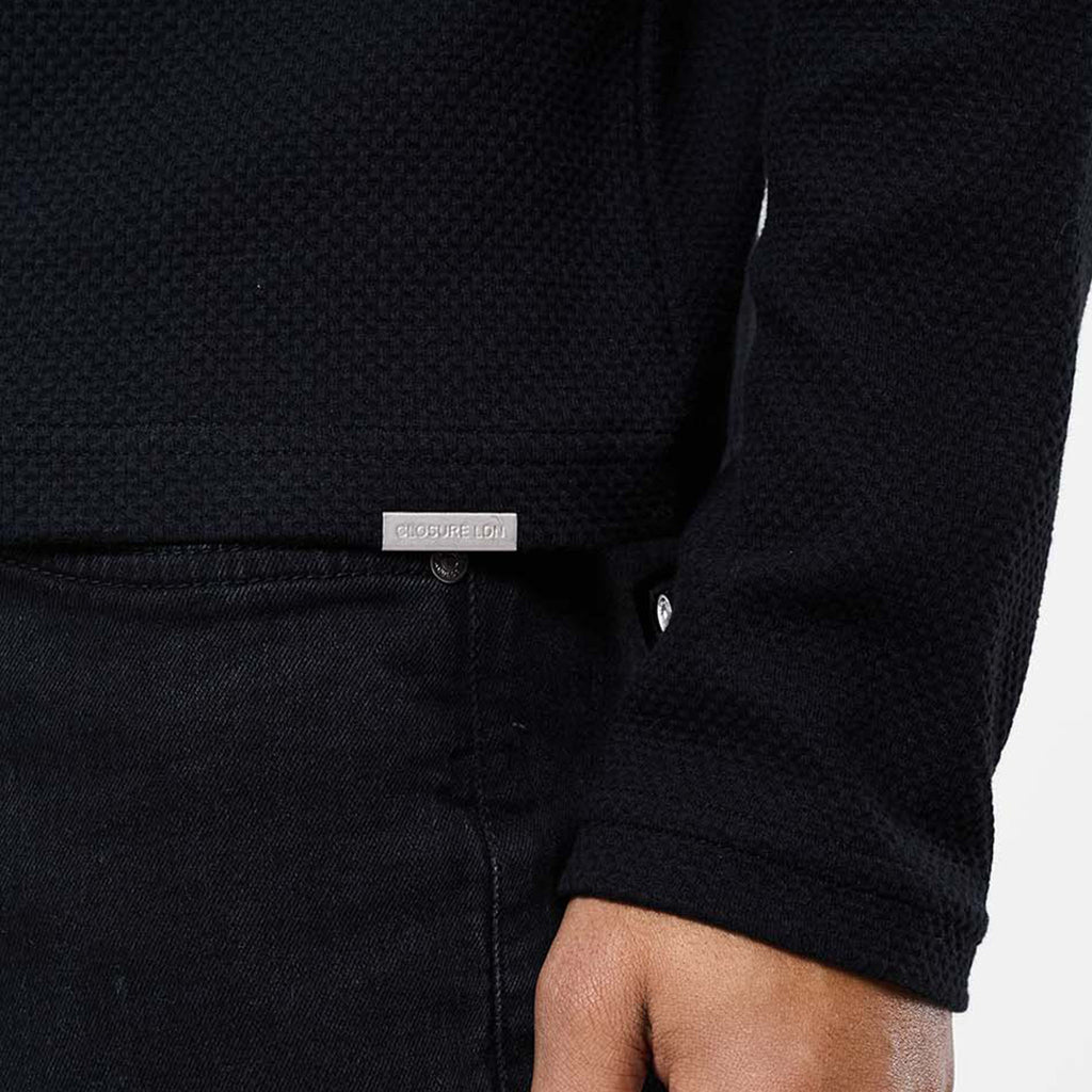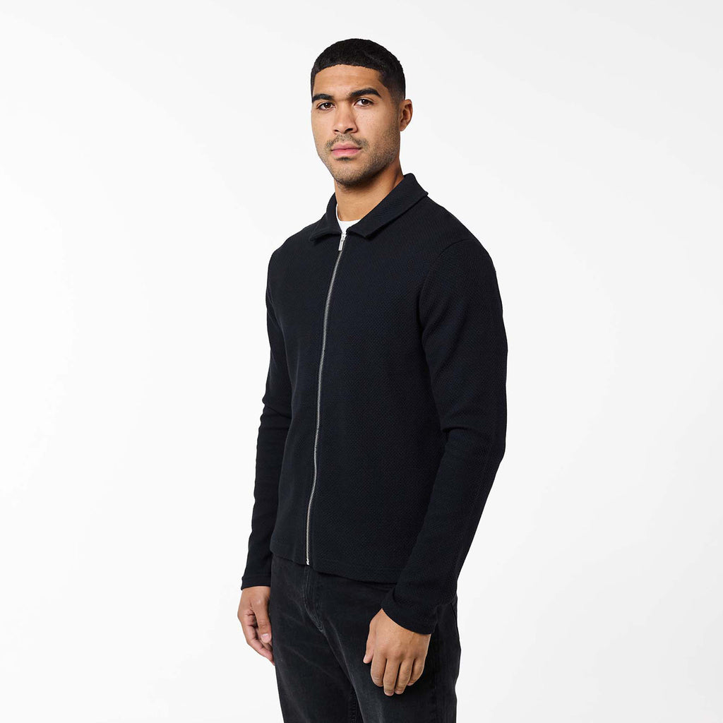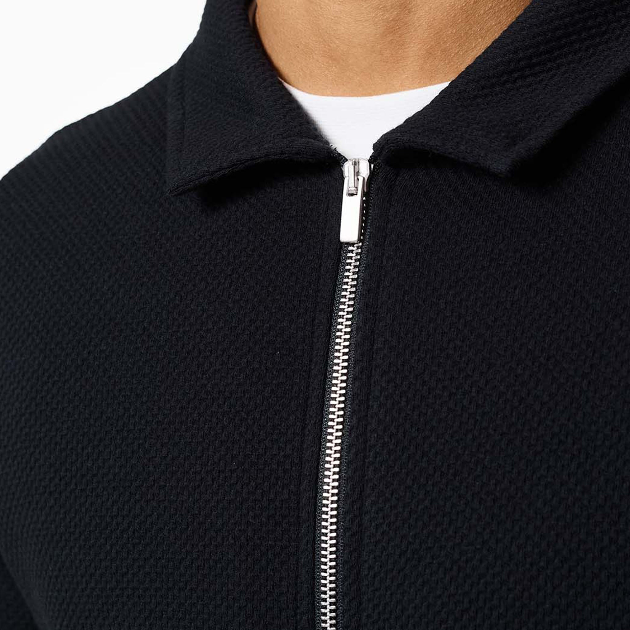Elevate your casual style with our new Men's Black Jacquard Full Zip Overshirt. This versatile layering piece is crafted from a unique 270GSM cotton jacquard fabric, offering a distinctive textured finish that adds depth to any ensemble. Features a crisp self-fabric collar and a sleek exposed metal zip, ensuring a refined aesthetic. Subtle Closure London metal badge branding provides a premium, understated touch. Perfect as a lightweight jacket alternative or worn open over your favourite classic tee, this black overshirt is an essential for any contemporary wardrobe.